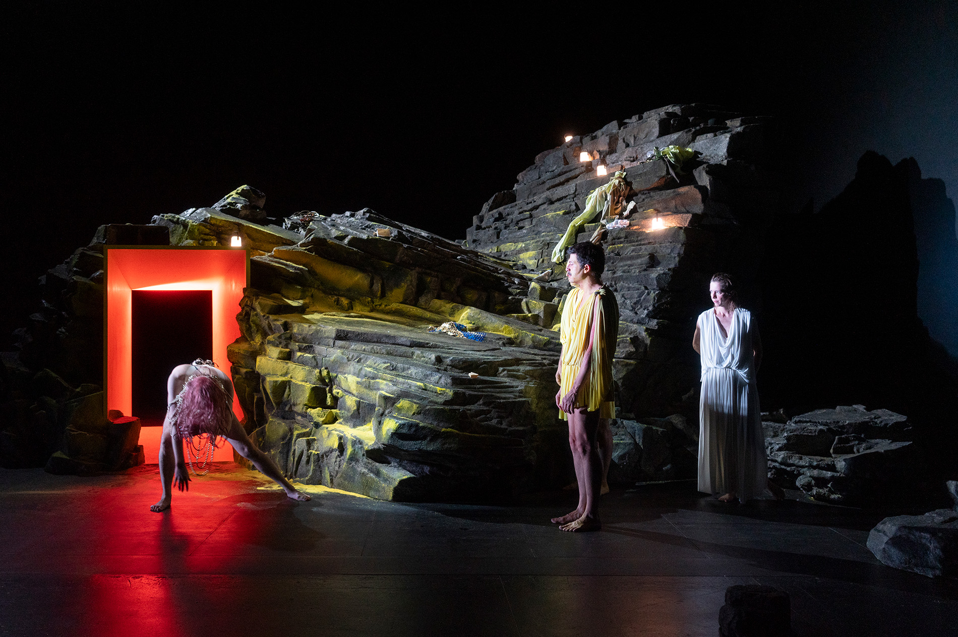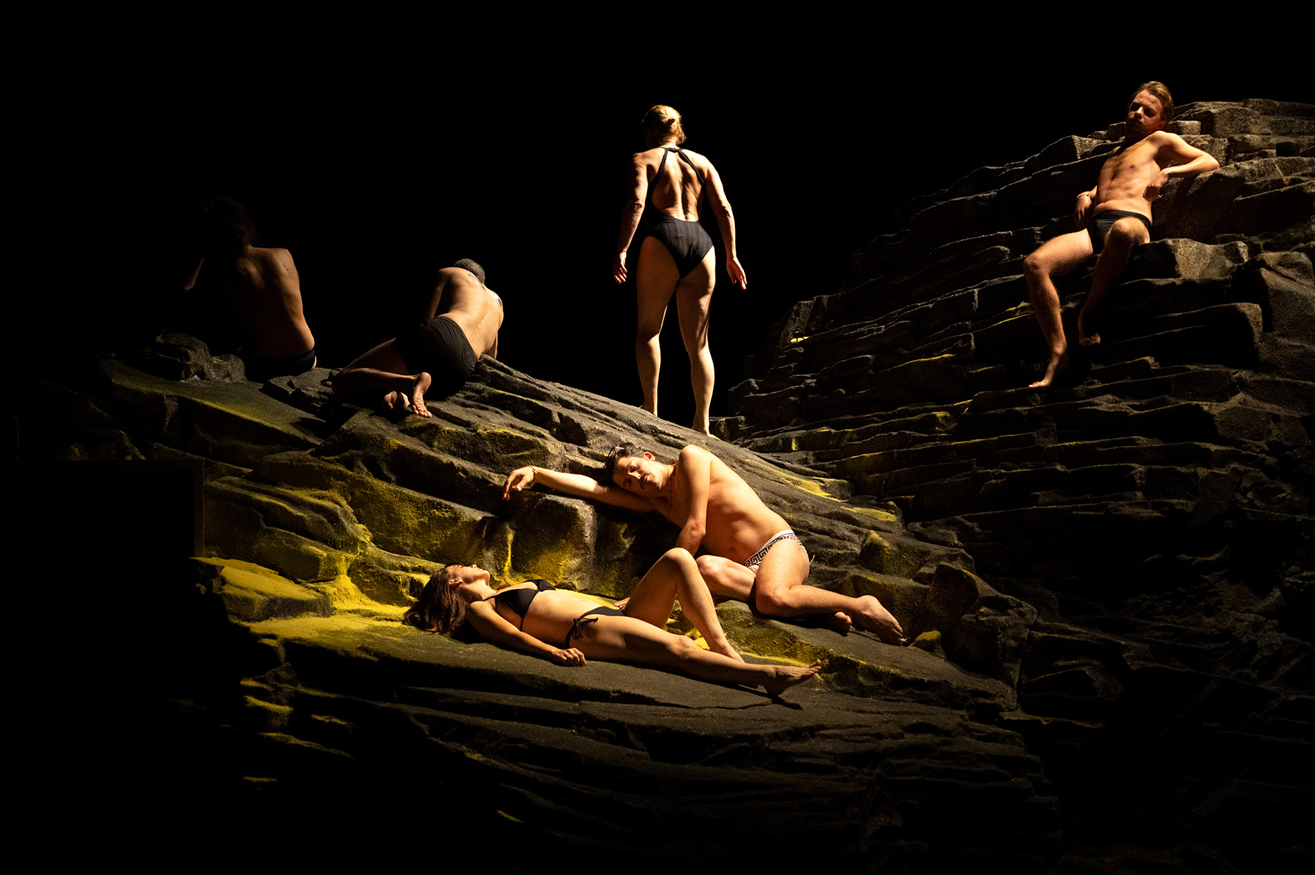 C’est une mise en scène monstrueuse, non dans le sens de la démesure, mais dans son exacte contraire, la retenue et la concentration. Il sourd une tension permanente que nul éclat de voix n’ose déchirer. Voix sonorisées, spatialisées (remarquable travail de Vanessa Court) pour que nous parviennent distinctement ce qui est proféré d’un ton assourdi, toujours neutre ou presque. Effet de déflagration garantie tant cette parole percute nos ouïes et nous parvient avec acuité. D’autant que Jonathan Capdevielle joue habilement sur le vide et l’absence, les corps se dérobant au regard, souvent hors-champs derrière ce rocher. On connait son art du ventriloquisme, cette appétence à dissocier la voix du corps. C’est ici radical et poussé à son extrême. Ne reste parfois que les voix, flottantes, en suspension, comme si la seule chose d’importance ici était le discours plus que ces conséquences. Ce qui entre dans l’histoire, y demeure, ce sont les paroles, non les corps voués à pourrir. Et c’est cette parole qui est mis en exergue par cette audace formelle.