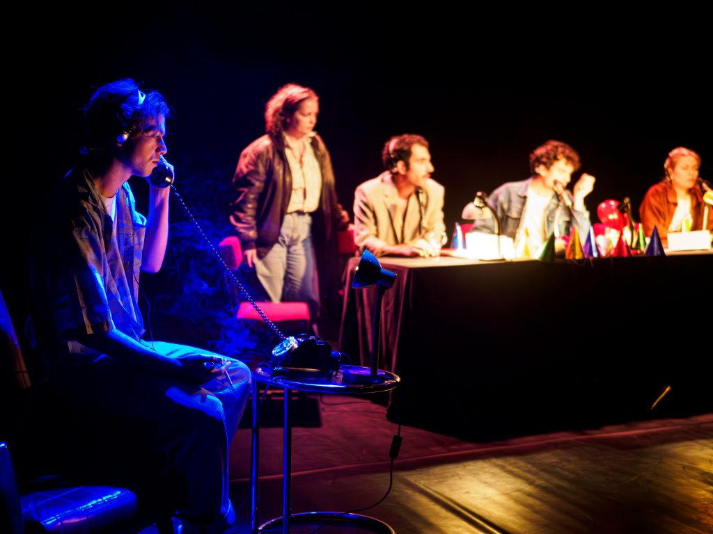 Nous voici donc invité dans le studio où Dani et Yaya, doubles fictionnels, officient en compagnie de Pascale, Fanfan et leur régisseur, entre deux tubes du début des années 80, écoutent la parole débridée et crue de leurs auditeurs qu’ils relancent et poussent dans leurs retranchements les plus intimes. C’est la toute dernière émission et règne comme d’habitude un foutu bordel ou les saillies verbales et salaces sont entrecoupées de pets et de rots. Seulement derrière ce chaos et cette parole trash exprimant une liberté d’être, de vivre une sexualité qu’on imagine être décomplexée, se profile une autre réalité, tragique celle-là, qui fauche une génération et à laquelle Dani n’échappe pas. La mort imminente de celui-ci, que nul n’ignore dans le studio, provoque en chacun une réflexion plus grave. Sur les liens qu’ils entretiennent autour de ce micro et qui se déferont après l’arrêt du programme, leur aveuglement devant cette pandémie, leur absence d’engagement aussi qui les met face à leur contradiction. La mort de Dani est une déflagration, une prise de conscience brutale sur une réalité politique et sociale d’une époque ambivalente où la condamnation unanime d’une communauté désormais stigmatisée par cette pandémie entraîne de la part de celle-ci un sursaut et un combat pour leurs droits jusqu’ alors obstinément refusés. Le SIDA siffle la fin de la récréation, de l’insouciance, cette libération qui s’amorçait à l‘aube des années 80 et met à nu les dysfonctionnement d’une société dont les politiques renâclaient encore à ouvrir aux homosexuels les mêmes droits qu’aux hétérosexuels. Les années 80 n’avait bientôt de rose pour la communauté homosexuelle que le triangle d’Act-Up. Chaque monologue en incise, pure fiction, dont le ton tranche radicalement avec celui libertaire de l’émission, n’exprime rien d’autre que ce désarroi et cette impuissance que la mort de Dani, puis celle longtemps après de Yaya, révèle.