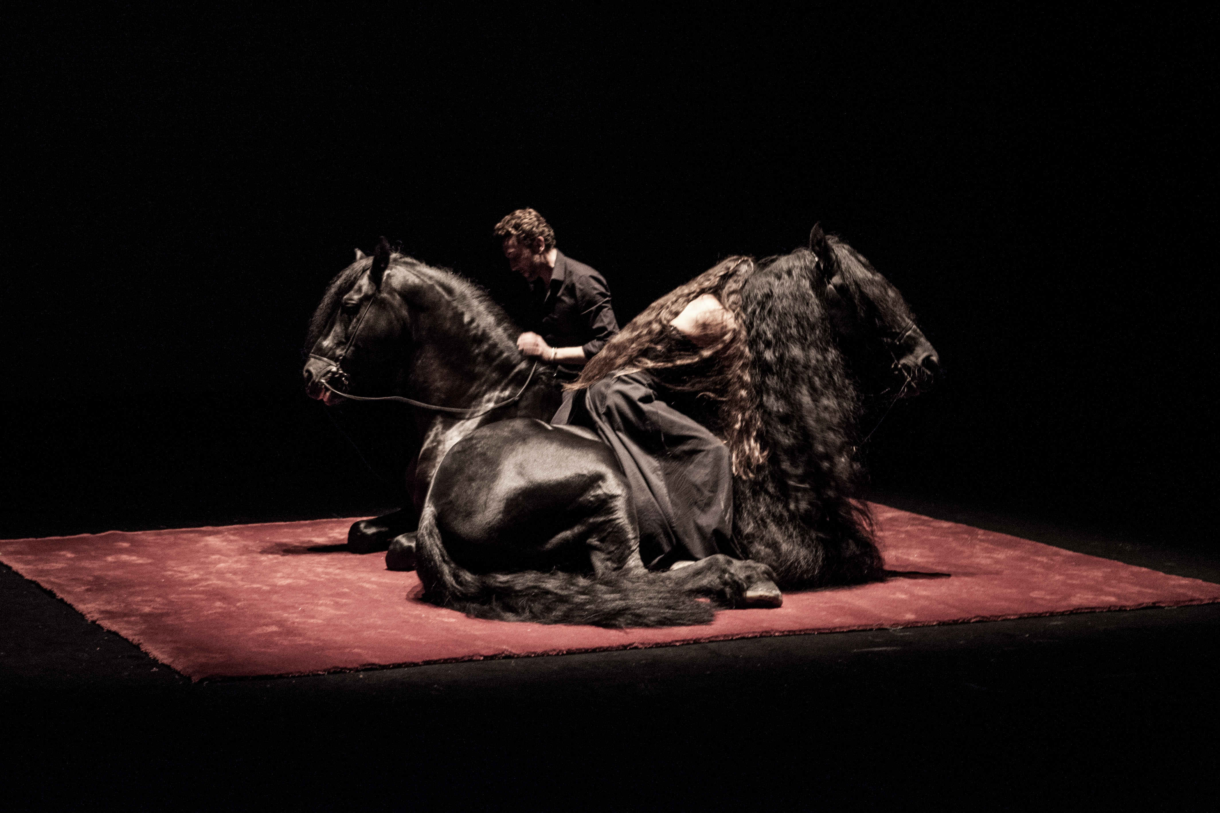 À leurs côtés, Indra et Gaia, superbes chevaux, habitent le plateau de leur présence animale et mystérieuse, comme sortis d’un rêve. Leurs robes noir ébène virevoltent, leurs souffles éventent l’air. Gracieux autant que robustes, ils confèrent une dimension picturale impressionnante à la performance. Et quelque chose d’unique se produit. Les hommes et les animaux dialoguent, se touchent, se hument, s’accompagnent. Égaux. Un lien très fort et unique les unis, quasi charnel, et semble se tisser entre eux un langage que nous ne connaissons pas. Pourtant, au loin, en nous, un espace s’éveille… La reconnaissance de ce qui nous fonde ? « Nous sommes tous des animaux. Des animaux prodigieux. Remontés depuis la nuit des temps. Nous sommes des bêtes. Assoiffées de nuit et/ou de sang, et nous hurlons notre désir de vivre. » nous dit Camille. Les quatre êtres se prolongent les uns les autres, à l’image de leurs noms qui s’agrègent eux aussi : Camille et Manolo ont abandonné leurs noms de famille pour les remplacer par le nom de leur moitié. Ainsi, Camille devient Camille-Gaia et Manolo, Manolo-Indra. C’est une véritable réinvention de la filiation qui s’opère de façon troublante, et qui vient bousculer tous nos codes.
