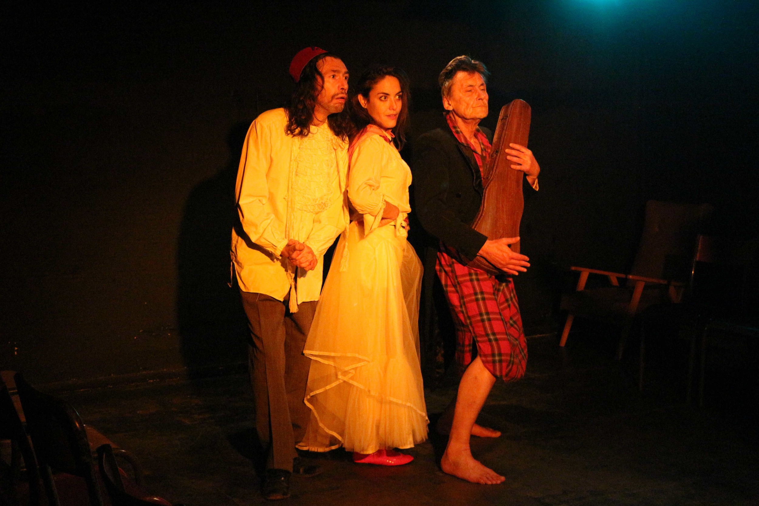 Le metteur en scène Dominique Dolmieu, et les neufs comédiens de la distribution, parviennent à établir une relation avec le public tout à fait surprenante et magnifique. Dans un espace plutôt réduit, les comédiens vivent à quelques centimètres des spectateurs, installés de manière bi frontale. Notre proximité avec leur corps, leur voix, les situations poussées à l’extrême grâce à un engagement total des comédiens, nous immergent dans une épopée de la vie. A travers quatorze tableaux-histoires et une quarantaine de personnages, nous traversons des villages, des mariages, des bunkers, Paris, une foire, des auberges… On y rencontre des damnés, des fous, des cruels, des naïves, des clowns, des amoureuses, des employés des services secrets, des révolutionnaires… enfin toute une galerie d’archétypes de sensibilités et de comportements humains. Pour mettre en scène cette profusion de vie, Dominique Dolmieu n’a besoin de rien ; pas de décor, à peine quelques accessoires, pas de costumes imposants, juste quelques signes vestimentaires, pas d’effets techniques vrombissants, un soupçon d’éclairage réfléchit pour les ambiances et les textures, quelques rumeurs sonores au loin pour creuser l’espace, lui donner du volume… Dominique Dolmieu retire tout et ne garde que le théâtre. D’ailleurs le texte de Goran Stefanovski joue perpétuellement avec la frontière entre la réalité, les rêves et le jeu. On est pris dans un tourbillon de vérité réaliste et d’échappée fantastique où TOUT peut advenir.