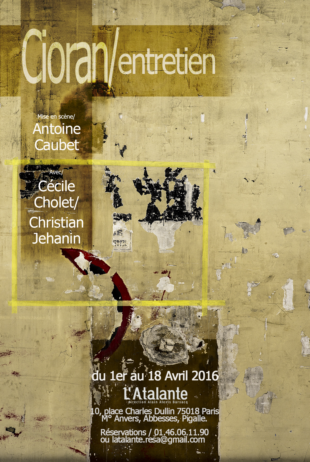 Notre principale interrogation en sortant de la salle porte sur la pertinence et l’intérêt dramatique de cet entretien au théâtre. Si la forme s’éloigne de l’objet théâtral, il faut quand même noter que la mise en espace et le jeu des interprètes nous y ramènent de par leur qualité. Ce spectacle se révèle être une adaptation des entretiens d’Emil Cioran (1911-1995), philosophe roumain qui fut interdit de séjour en Roumanie sous le régime communiste à cause de ses écrits. Le metteur en scène Antoine Caubet nous donne à voir les atermoiements de l’auteur, ses anecdotes souvent cocasses concernant sa vision du monde ainsi que des histoires de famille (fondatrices pour le philosophe qu’il deviendra), le tout livré par Christian Jehanin avec grande émotion. Le choix du texte n’est malheureusement pas à la hauteur des moyens déployés, celui-ci est marqué par un ton mièvre, manque de sel et ne présente aucun intérêt philosophique ni littéraire. Sur le plan du jeu des acteurs et de la mise en espace, le pari est gagné grâce à la forte présence de Christian Jehanin qui nous fait découvrir avec discrétion une figure mélancolique emplie de doutes et de peurs, tout en laissant sa place à l’humour. Le rôle de Léo Gillet a été donné à la comédienne Cécile Cholet qui transforme l’interrogation en confession lorsqu’elle sollicite le démiurge. De belles accointances sont rendues sensibles par le truchement des comédiens : la virilité de Cioran, livrée ici par le comédien se fond dans la sensualité palpable de Cécile Cholet. L’écoute et l’attention entre les deux artistes se tissent entre les aphorismes et les axiomes. La mise en espace, volontairement réduite pour se concentrer sur l’entretien est tout à fait adéquate et les interprètes se meuvent dans l’espace confiné de l’Atalante, créant ainsi – grâce au jeu subtil des lumières et au parcours entre les tables – un chemin presque imperceptible que l’auteur semble vouloir nous livrer. La scénographie intelligente se prête parfaitement à l’exercice et le jeu des comédiens restitue les doutes, les desseins et les vues de Cioran.