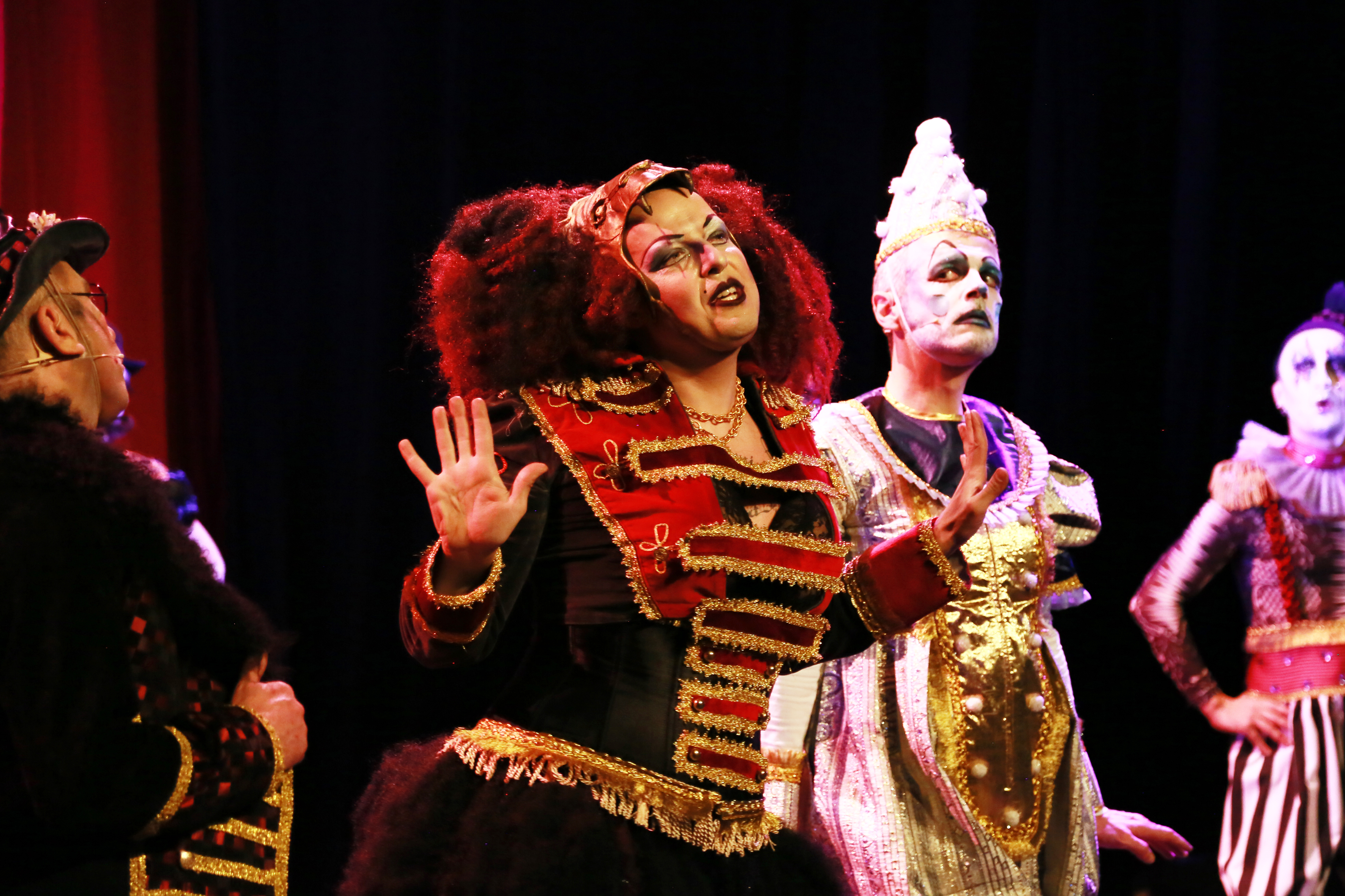 C’est une comédie musicale encore une fois totalement déjantée et loufoque. Une piste aux étoiles glam chantée, dansée, jouée avec un talent grand comme ça. Une vraie générosité, marque de cette compagnie d’amateurs éclairés, entourée de professionnels qui poussent au meilleur. C’est incontestable, de créations en créations, c’est de mieux en mieux. Ca dérape toujours un peu parfois, pas tout à fait en rythme, pas tout à fait juste, mais on s’en contrefiche totalement. La troupe en son entier, comme un seul homme, même travesti, s’en donne à « chœur » joie. Alma de Villalobos, la chorégraphe, et les arrangements musicaux de Samuel Rozenbaum, entraînent tout ce monde dans une dynamique folle, un tour de piste au galop. Stephan Druet à la mise en scène va droit au but et fait de cette ménagerie sans animaux un barnum queer en folie. C’est plein de trouvailles, de rebondissements, d’humour et d’humeur. Les costumes et maquillages de Denis Evrard sont magnifiques, clinquants, colorés, d’une belle originalité, digne des grandes productions musicales. On rit, on s’émeut, on applaudit. Ca frappe dans les mains vites endolories, ça tape des pieds en cadence, ça hurle de rire au risque de se bloquer les zygomatiques. La salle est embarquée dans cette joyeuse parade, ce manège enchanté, ou les freaks ne sont pas forcement ceux à qui on pense.