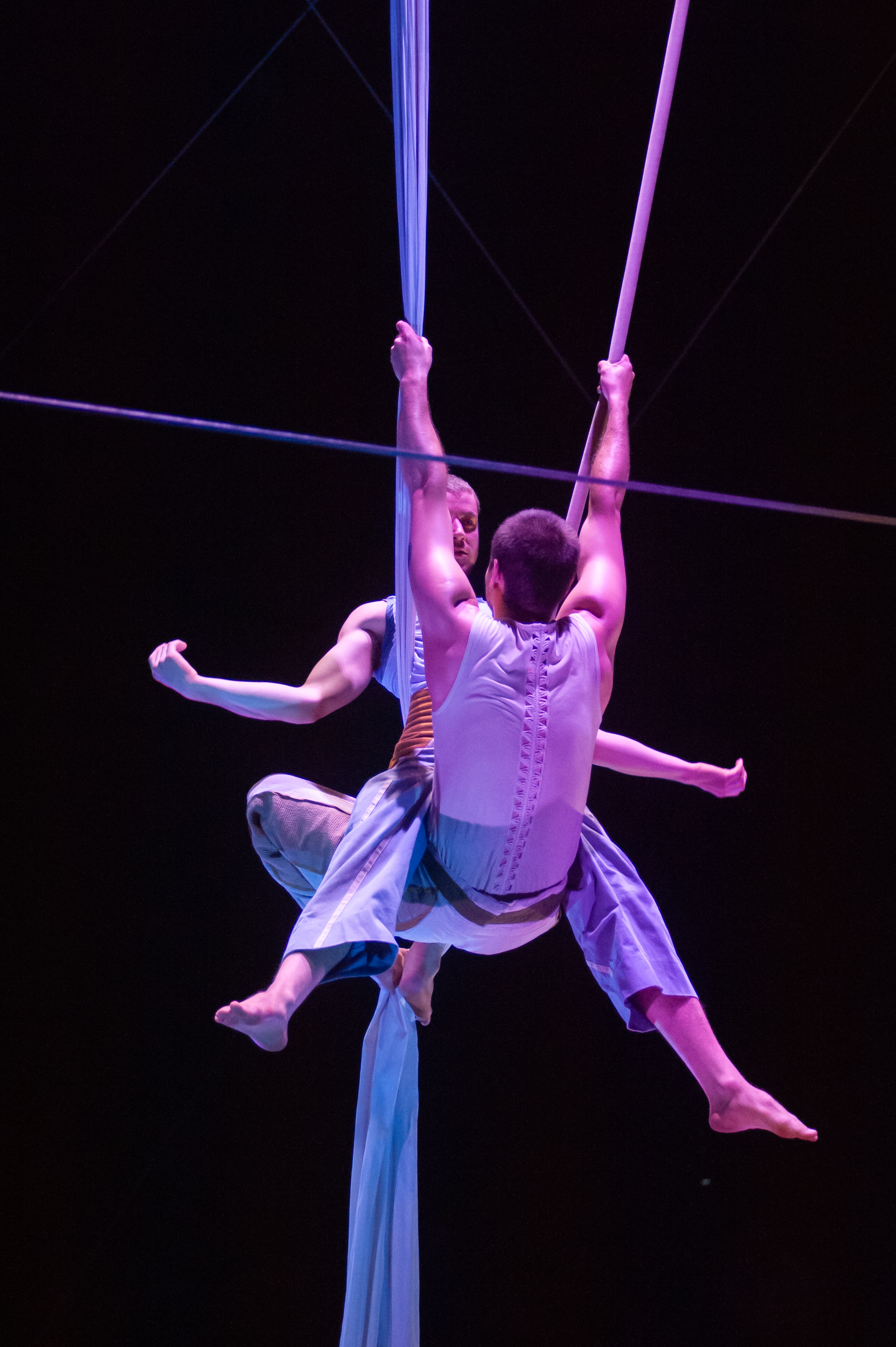 Sous le Chapiteau de la Villette se déploie devant les spectateurs une espèce de toile d’araignée, avec des fils tendus de partout, s’entremêlant, en long, large et diagonale. Comme une forêt de lianes, comme la cage à écureuil des jardins d’enfants, où s’ébattront les sept circassiens. S’y ajouteront au long du spectacle tissus aériens, corde lisse et mât suspendu, autant d’agrès en apesanteur, qui savent aussi régulièrement laisser la part belle aux acrobaties au sol.