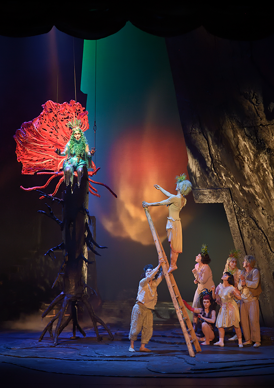 La mise en scène d’Omar Porras respecte, pour le meilleur, tous les canons esthétiques qui seront ceux un peu plus tard des féeries : du merveilleux, du plaisir, de la magie, de l’exubérance, du comique. Les hauteurs sous les cintres sont exploitées pour laisser la place à des décors spectaculaires, parfois presque fantasmagoriques d’Amélie Kiritzé-Topor, et produire des effets surprenants en particulier les feux d’artifice, qui inondent régulièrement le plateau d’une lumière qui devient enchantement, notamment à chaque apparition d’Apollon, ou à la seule commande gestuelle de Protée.