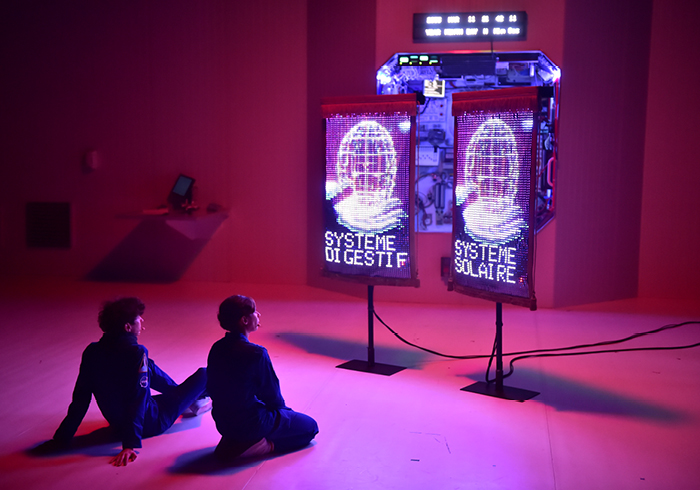Au cœur d’un impressionnant dispositif scénique où l’on voit le temps défiler bien plus vite que la lumière et la planète bleue s’éloigner et disparaître derrière le hublot, les « concierges de l’espace » nous narrent la dérisoire fable de leur déchéance, génération de clones après génération de clones. Le langage (thème cher à Halory Goerger) se désagrège, les codes se travestissent jusqu’à la parodie finale. Les situations existent, soit, mais restent de nature purement anecdotique, plates bouffonneries dénuées du relief philosophique annoncé. Le moment passé n’est guère désagréable, un plaisant vide interstellaire, comme une impression d’être un peu gris, d’avoir inhalé de cet isolant thermique tant prisé par Boulogne et Goerger.