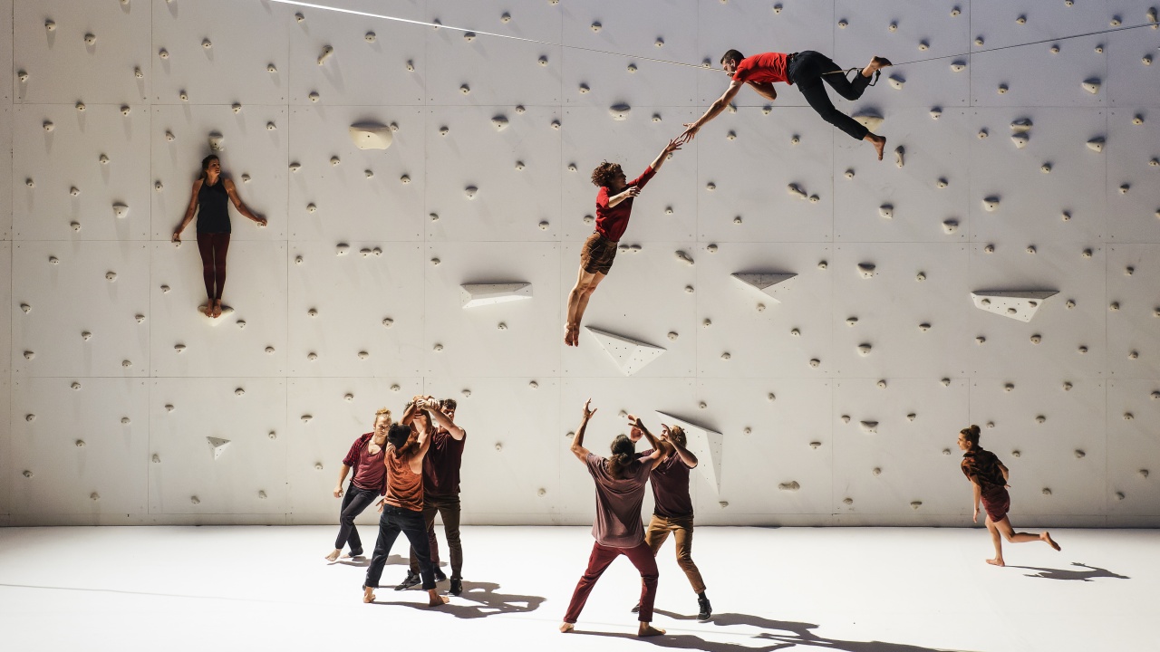 Sur le plateau de Chaillot où le lointain est occupé par un mur de varappe, qui devient écran quand nécessaire, Rachid Ouramdane les invite donc tous deux, parmi des circassiens voltigeurs, confrontés eux aussi à l’appréhension du vide dans cette volonté d’aller toujours plus haut, où prendre son envol se heurte de facto à la pesanteur. Une prise de risque calculée, un travail minutieux et collectif, qui n’empêche pas l’accident, la chute, « où le sol se dérobe sous vos pieds. » Evoquée par une circassienne, c’est une expérience aux conséquences psychologiques pouvant être dévastatrices. Et c’est aussi ça qui est exprimé ici, cette fragilité, cette humilité, voire cette sensibilité parfois écorchée que le rapport à la suspension, l’aérien donne. Ce ne sont pas des héros, mais des sportifs, certes virtuoses, mais conscients du danger qu’ils apprivoisent. Cependant, alors que près des cintres Nathan Paulin évolue sur son fil souple, sur le plateau Rachid Ouramdane chorégraphie porteurs et voltigeurs défiant en des figures de plus en plus complexes et vertigineuses la pesanteur. Qu’ils soient accrochés au mur, où sur les épaules d’un partenaire, lui-même sur les épaules d’un autre porteur, ils se jettent avec art dans le vide, se laissent tomber sans retenue. C’est un ballet aérien où les corps semblent étrangement, et sans doute est-ce une illusion, un court instant seulement, flotter. Rachid Ouramdane structure avec fluidité cette partition circassienne, attentif à l’engagement des corps, aux mouvements singuliers qu’oblige cette discipline exacerbant la verticalité, lui donnant de même un tempo particulier, une certaine lenteur où tout semble être, oui, en suspension, de la prise d’élan à la réception du voltigeur. Ce n’est pas de la danse mais la question est la même qui traverse danseurs et voltigeurs, comment s’affranchir de la pesanteur. Cependant, en observant Nathan Paulin sur son fil, se rappelant ce qu’il disait en préambule, malgré le vertige qui nous prend lentement au long de cette création hybride, on se dit qu’il y a quelque chose de méditatif, que le sens donné à tout ça, est d’abord cette quête non de sensations extrêmes mais bien d’une liberté à nulle autre pareil, au risque du saut dans le vide et de la chute.