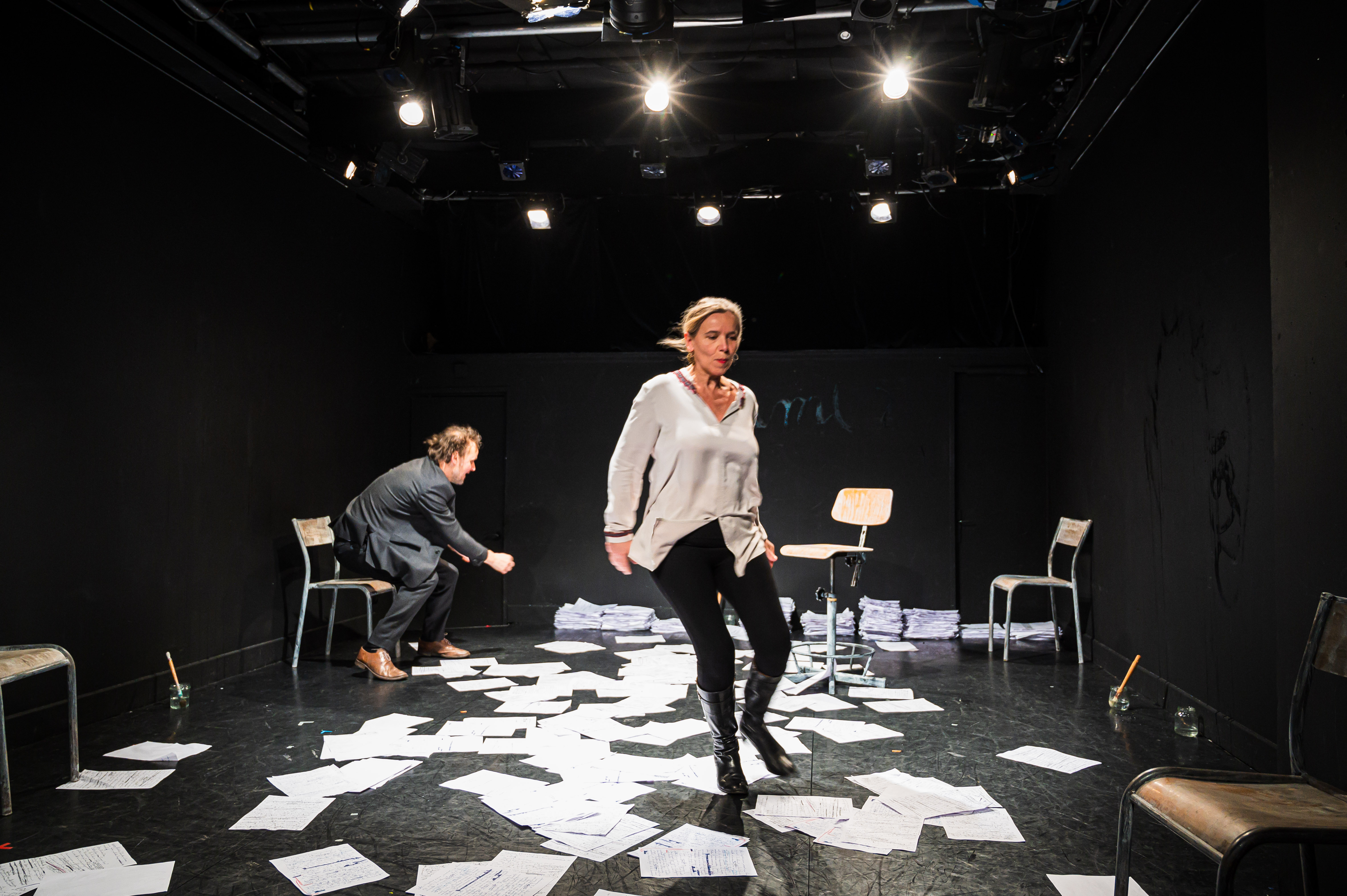La scénographie épurée, pourquoi pas me direz-vous. Des chaises jonchent la salle, cadavres des futurs déplacements bien trop précis et sages à la lumière de cette mise en scène, des bouts de textes en fond qui ne seront pas utilisés. Une des partitions quant à elle aura l’honneur de se voir éparpillée sur la scène, par la suite écrasée, malmenée par les déplacements des acteurs. Là c’est le choix du metteur en scène, battre les mots au profit du sens, des corps, de cette confrontation charnelle à l’image de la passion des amants. Nous avons donc le droit à deux petites chorégraphies de jeux de chaises, du chat et de la souris, de Tchekhov et de Lika maladroitement exécuté.