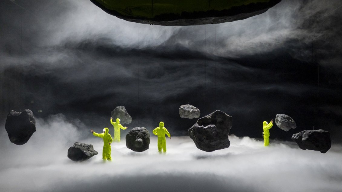 Une soucoupe volante en forme d’astéroïde, tranchée comme dans un plan de coupe, habitée par quelques astronautes. Leurs mouvements miment l’apesanteur. Ils débarquent sur une planète, en l’occurrence le plateau. Ils se glissent hors de leur vaisseau somme toute très écolo. En combinaison jaune fluo, les voilà au milieu d’astéroïdes qui performent leur petit ballet de montées descentes, sans acide. Leur mission : réenchanter les pierres dansantes de l’espace. Philippe Quesne feint d’oublier combien l’injonction au ré-enchantement a été démonétisée par François Hollande qui en avait abusé dans sa campagne. On voit bien où Cosmic drama voudrait en venir, on sent bien les essais, les tentatives mais il faut reconnaître que la plupart tombent à plat, ce qui n’est pas du meilleur effet pour partir en fusée. Cosmic drama est dans la citation du genre, mais n’a pas l’énergie du pastiche. La joliesse de la petite histoire a des semelles de plomb. La faute à une écriture de plateau poussive où rien ne peut se détacher à part une scénographie surplombante mettant en exergue la virtuosité des jeux d’orgue du théâtre. Ça lorgne du côté du burlesque mais c’est trop timide ou théorique pour que le tout prenne véritablement corps. Ça manque de corps en fait, et c’est embourbé dans des idées sur comment être drôle. On reste donc à terre, atterré, et les rares moments qui semblent pouvoir nous faire rire, ou pour le moins sourire, sont trop rares et dilués pour pouvoir encore nous soulever et nous enchanter. La dramaturgie, il semble y en avoir une, est absconse et doit travailler des degrés qui ne sont pas accessibles au commun des terriens. On reste de marbre comme l’astéroïde qui ne veut plus danser la gigue. Et puis face à la démesure, face à cet objet creux que la mise en scène tente de réanimer et remplir à grand renfort de musiques (y compris la Pathétique), de gags potaches, face aux décombres et aux ruines du théâtre que Cosmic drama semble déplorer alors qu’il en est à l’instant l’artisan, face au vide, il m’apparut comme une évidence que la dernière création de Philippe Quesne pourrait être au spectacle vivant ce que Jeff Koons est à l’art contemporain : une vaine et coûteuse illusion.