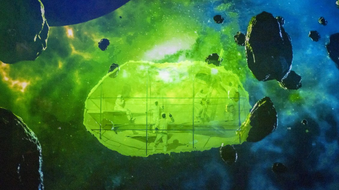 Cela démarre comme un film. On ne peut être plus littéral dans la citation : sur l’immense écran qui couvre l’ouverture de la scène de la grande salle de la MC93 défile un générique sur fond d’étoiles, de planètes, d’astéroïdes, qui annonce, après avoir égrené les noms des acteurs et actrices, Directed by Philippe Quesne. Musique hollywoodienne de space opera.