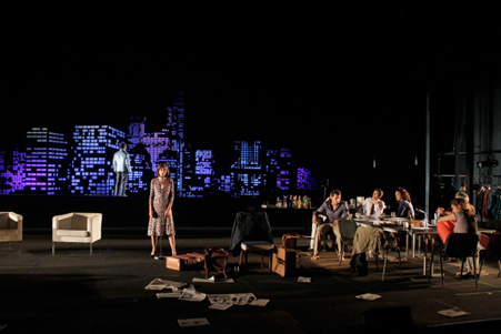 Le plateau livre un décor rappelant assez une salle de répétition : grande table couverte de textes et agrémentée de bouteilles d’eau, miroirs de loges et portants chargés de costumes, canapé et fauteuil rudimentaires. Puis, sans le noir rituel, les comédiens entrent en scène bruyamment et nonchalamment, avec l’énergie particulière d’une troupe au travail. Certains feuillètent le script, esquissent un pas de danse. Puis, le premier tableau se met en place et l’histoire peut commencer.