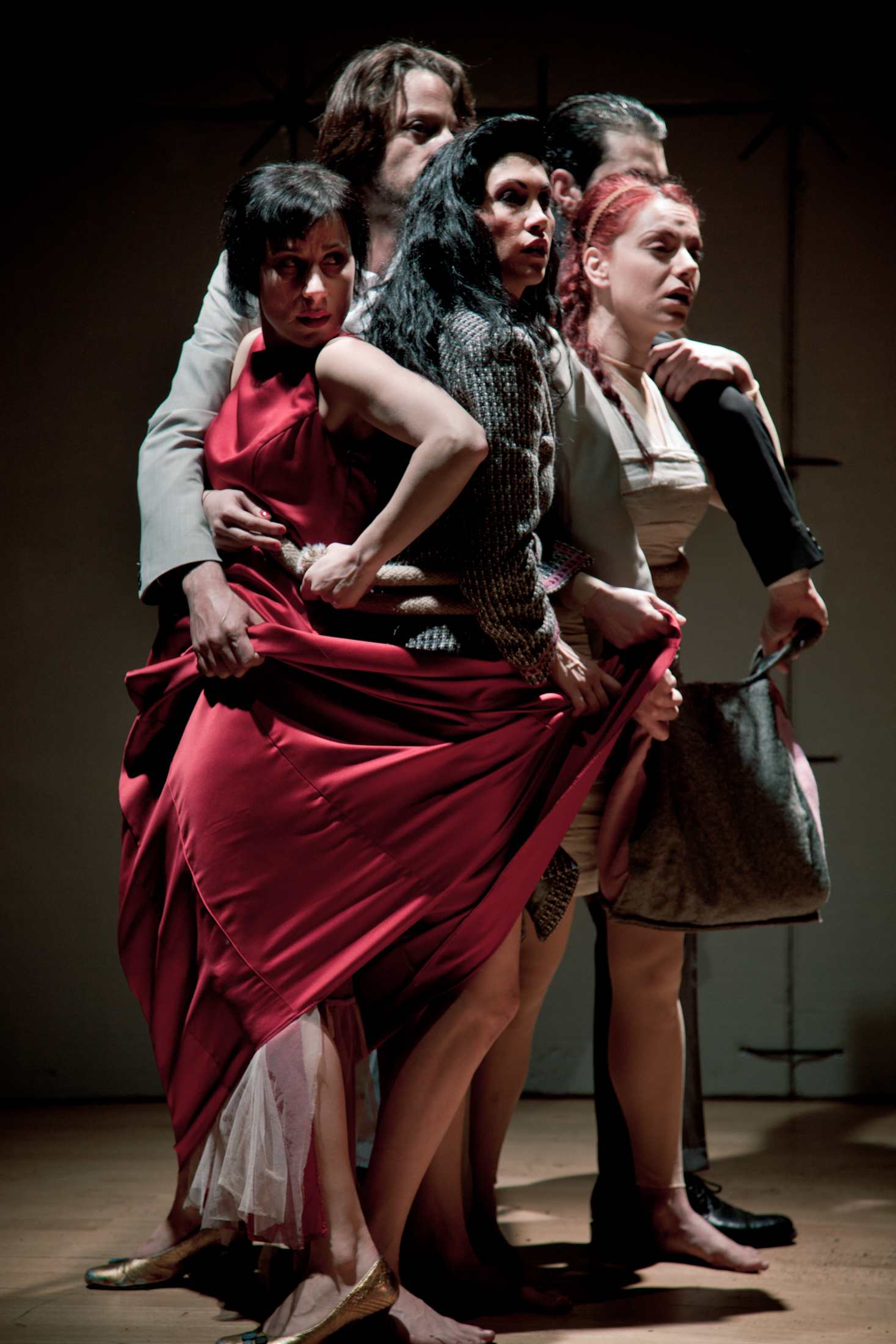6 acteurs, dont 3 femmes vont commencer une drôle de gesticulation muette sur des images d’Athènes. Le commentaire nous parle de démolition, reconstruction de parois de verre lisse et de balcons. La représentation du peuple se fait à travers les trois femmes. L’étrangère, celle qui porte la terre avec elle, une allégorie de la gauche dans sa robe rouge et une fille du peuple. Entrée des névroses d’une population suicidaire « qui ne s’aime pas ». Monsieur Loyal, incarné par une femme très androgyne, s’empare du micro pour interroger les acteurs. Où sommes-nous. Sur une scène de théâtre, dans un asile de fous. Ils doivent apprendre à aimer être des esclaves, aimer être des esclaves ou mourir. Dans le trop plein d’informations qui se dit, en même temps qu’on doit regarder, se glisse un chiffre. 1760 suicides en deux ans. Au travers de la métaphore de l’asile se rejoue, sous forme de psychodrame, les quelques 100 dernières années. Ainsi s’effleure, pêle-mêle, un caléidoscope de pistes qui cherche leur explication : 1922, le bombardement de Smyrne, le dette de guerre effacée de l’Allemagne, la question de l’eau, la collaboration. Émaillé de chansons d’amour, le spectacle tente de comprendre comment ils en sont arrivés là. Le père de la nation, en redingote, qui rappelle Papandréou lors de ses interventions au parlement, affirme de son estrade : « Je vous ai assuré la sécurité ». L’histoire des ‘Georges’ se déroule, douce amère, se déplie, se débobine, le grand George, le petit, quelque part un robinet coule, la logorrhée continue, comprendre à tout prix, le pourquoi ils ont laissé faire, la collusion entre le peuple et ses dirigeants, le clientélisme, pourquoi ils ont laissé transformer le théâtre « Amore » en supermarché, « on est toujours à la recherche de nos racines » dit pourtant l’un d’entre eux.