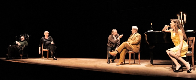 Claude Duparfait et Célie Pauthe ont réussi l’adaptation de ce roman de Thomas Bernhard, “Des arbres à abattre”, écrit en 1984, en rendant présent et choral, un souvenir personnel initialement relaté au passé. Leur mise en scène, abordée comme une reconstitution vivante, traduit avec brillance la chair du souvenir d’un événement intense et traite les différents niveaux de lecture du récit par des variations du mode d’interaction narrative entre les personnages. La scénographie met particulièrement en valeur la densité d’expérience humaine en ne soulignant que la force du langage et des mouvements énergétiques des comédiens et en réduisant tous détails visuels à leur simple rôle de facilitateur de compréhension. Le spectateur en retire l’impression forte d’être le témoin direct de la récapitulation objective d’un événement dont les développements sont hautement porteurs de sens. La tonalité du jeu des comédiens édifie des personnages étranges, outrés, parfaitement représentatifs de la forme que prend l’image des autres dans le récit interne que l’on se fait d’un épisode qui nous a touchés. Ils possèdent un relief supérieur à celui du quotidien, leurs traits sont marqués par la force des intentions, celles qui procèdent du point de vue du narrateur, bien sûr, mais aussi celles autrement plus éprouvantes et fascinantes qui résident dans le sens des événements.