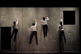 Le plan, initialement incliné, transforme des acrobaties originellement classiques en moments suspendus, merveilleusement aériens. L’effet de ralentis qui en découle nous subjugue et renvoie au cinéma muet ou au théâtre de marionnettes. Les figures, tantôt follement actives, tantôt passifs paquets coulant verticalement sur le plan gris, prennent des aspects poétiques imitant l’atmosphère déroutante des toiles surréalistes.