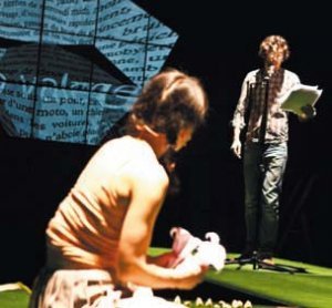 Anne Théron n’a pas souhaité faire un spectacle du texte de Tarkos mais le faire entendre, le matérialiser afin de proposer une mise en perspective puissante, dont l’objectif est de questionner le mouvement du flux financier en écho du texte. L’habillage numérique permet lui aussi d’offrir à cette proposition une esthétique qui s’impose comme une force de frappe, un tour de force mené de main de maître. Micro à la main, S.Nordey parcourt la scène pour dire le texte selon des inflexions à couper le souffle. L’ensemble de la performance oscille entre une course effrénée vers l’abîme et une volonté implicite d’un retour au calme. Candide et innocente, Akiko Hasegawa, a quitté son épaisseur ouatée pour s’offrir à la dévoration qu’elle tente de freiner par ses regards interrogatifs, ses interjections, ses échanges en japonais avec S.Nordey. Belle illustration colorée, elle permet de ponctuer le texte dit et d’amener des retours au calme lorsque la course devient trop haletante.