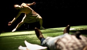 La Gaîté Lyrique présente une création associant le multimédia à la beauté d’un texte fort dans un espace inattendu ne proposant pas de ligne de lecture imposée. Une salle rectangulaire au sol recouvert d’un gazon synthétique et au milieu de laquelle une scène, en forme de L, ouvre le chemin des possibles, se prête à la déambulation durant le spectacle. Pas de fauteuils, ni d’assises confortables pour accueillir le spectateur, la verticalité est de rigueur ! Un sentiment de saturation s’installe sournoisement à mesure que le flux financier et le flux verbal du poème dit se croisent dans un chaos multimédia projeté sur les murs de la salle. L’argent, flux dominant qui gère le monde sans support matériel réel, devient un objet construit par Christian Van der Borght, spécialiste des scénographies digitales.