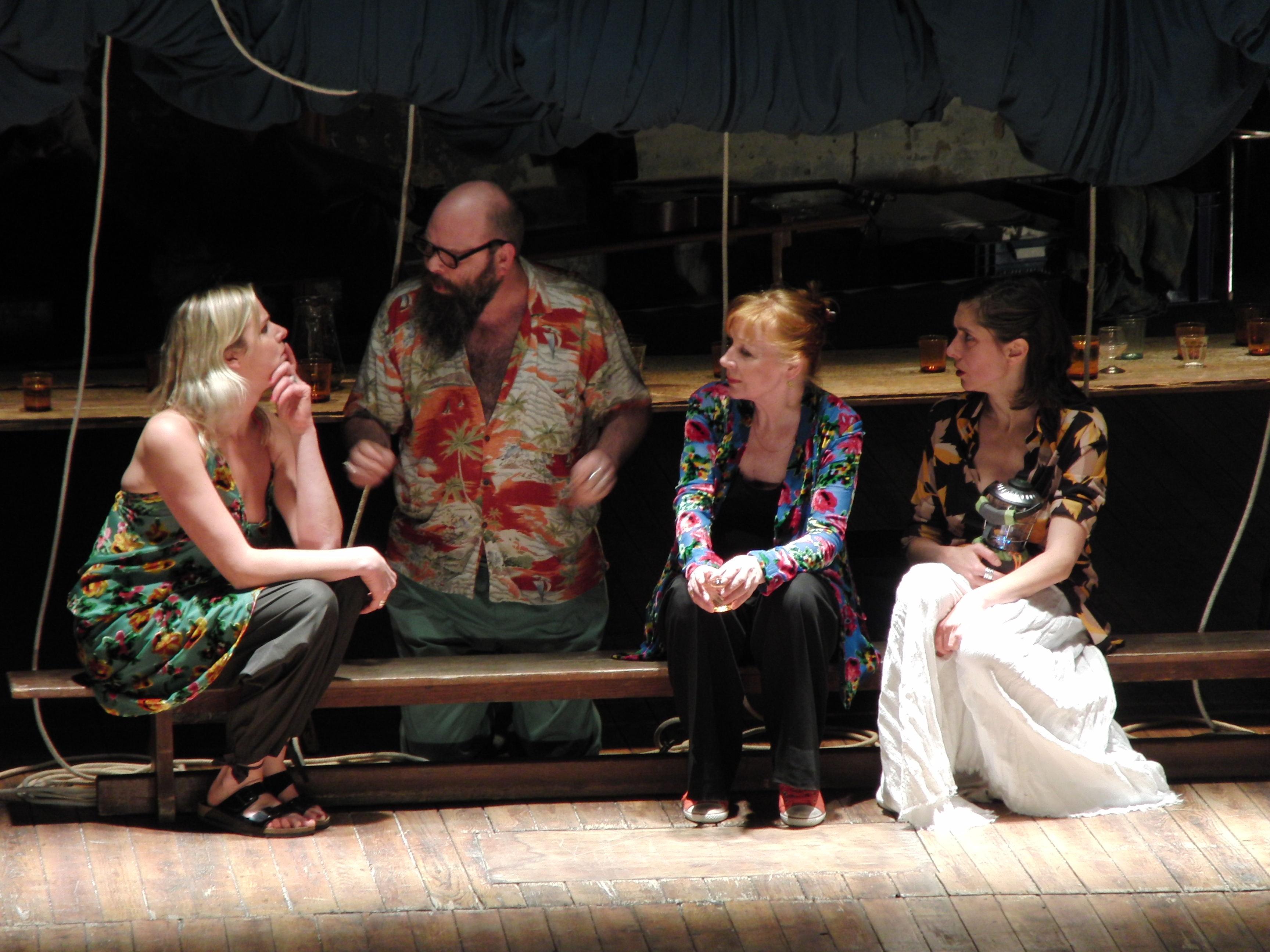 On est à la fête. On rit et l’on est en permanence dans l’action et le jeu. C’est brut et convivial. Mais rien ne se perd sur le regard de la matière humaine des personnages de Gorki. Le choix de la pièce Les Estivants, découle de nombreuse lectures qui ont mises à jour les thèmes chers à l’engagement de tg STAN : la vie, la solitude des êtres, la politique et l’amour de l’erreur humaine. Il fallait donc Gorki. En voilà un qui ne va pas par quatre chemins pour représenter une bourgeoisie oisive. Le vide de l’espace limité de ses personnages dans leur petit monde se manifeste dans d’interminables palabres. Ils errent dans la vie, sans se reconnaître dans la masse de leurs semblables. Leur velléité de tenter de se connaître est l’excuse de ce quotidien du rien. La critique de Gorki envers cette classe sociale est troublante quand on sait qu’octobre 1917 signera leur arrêt.