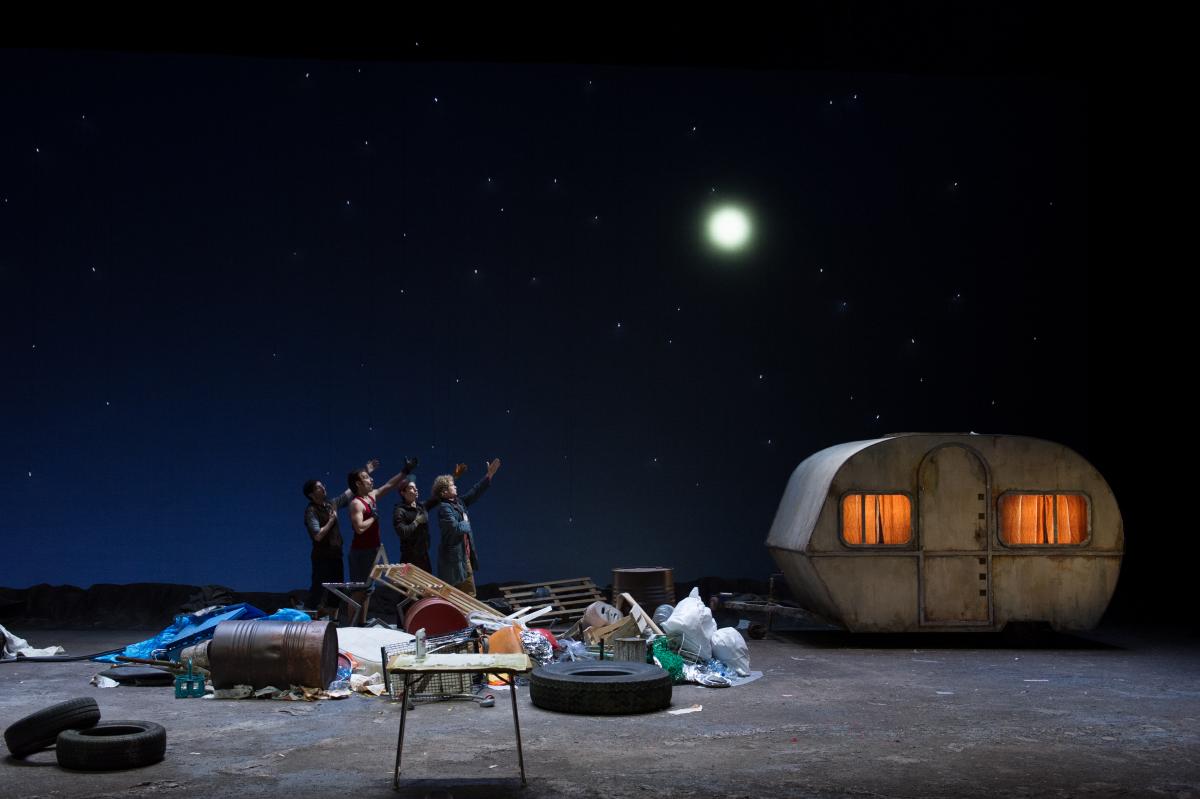 Inspiré de l’exubérance du cinéaste Ettore Scola[i], David Lescot sert merveilleusement l’univers bouffe et potache de l’œuvre. Au sein d’un hétéroclite fouillis d’objets en tous genres : pneus, chariot de supermarché ou encore monceaux de plastiques, se dresse la branlante caravane de Buonafede. Sur les décombres amoncelés, restes informes et inutiles, le metteur en scène fait naître de très beaux moments de théâtre. C’est l’art du recyclage et de la métamorphose poussé à son paroxysme. Quelques draps à peine blancs et nous sommes transportés, avec Buonafede, sur l’astre nocturne. Un parasol ou quelques bâches et robes et crinolines apparaissent comme par magie.