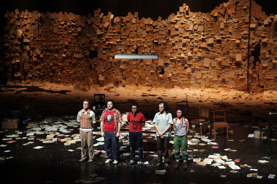 Devant un mur de pages, feuillets épars couverts de signes, les cinq comédiens évoluent dans un décor chaotique fait de livres surtout, de livres partout. Au centre, une table et cinq chaises. « Regardez-nous nous sommes au fin fond du monde. Derrière la cordillère ». Convoquant, à tour de bras, Allende, Martin Luter King, Rosa Luxembourg, Gandhi, Neruda, Marx ou Jean-Claude Van Damme, les projets scéniques se montent et se démontent autour de l’indéfectible volonté de sauver le monde. Et si l’on faisait venir des enfants africains rachitiques ? On pourrait leur coller des mouches sur le visage pour faire plus vrai. Et, face à la Moneda en flammes, on pourrait aussi s’immoler en direct pour faire réagir le public… Alors ? Qui veut bien mourir sur scène ? « Pero de verdad ! »… et avec, en fond sonore, la BO d’Amélie Poulain.