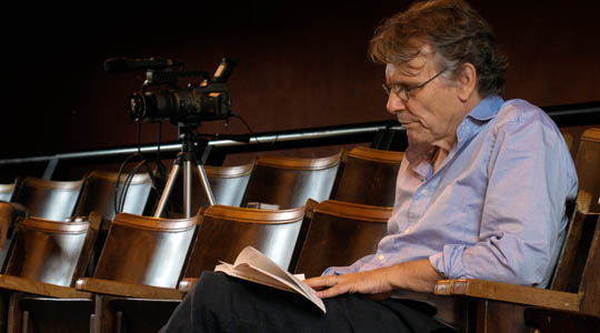 L’auteur-interprète parcourt un chemin de soixante-quinze années de vie avec beaucoup de vérité et d’humanité. Avec comme appui de jeu le récit d’un corps qui n’est pas le sien. Daniel Pennac nous captive par ce rapport subtil qu’il entretient avec ce texte. Les mots sont précisément choisis, les nuances sont parfaitement trouvées. Il sait aussi bien prendre la parole d’un enfant de douze ans que celle d’un homme aux derniers instants de sa vie, car il trouve sa justesse dans ce qu’il est, tout simplement. La voix de l’écrivain résonne, et nous prend avec elle, dans ce théâtre si atypique du théâtre des Bouffes du Nord. Cette scène dont les murs vieillis, mais encore chauds aux pigments rougeâtres-orangés dont la hauteur se conclue par une coupole gravée, est un véritable décor à elle toute seule. Elle offre une qualité de son et d’image à laquelle il n’est d’ailleurs presque pas nécessaire d’ajouter d’éléments de décor comme par exemple, une nappe de pelouse disposée sur une table en bois (renfermant une trappe que le comédien ouvrira pour laisser voir des photographies et des schéma de squelettes, ainsi qu’un sablier qui comptera les derniers moments d’un corps qui se défait de son allure fière et de son fonctionnement si bien étudié). Mr Pennac est déjà un bel élément qui s’inscrit dans l’espace de jeu, il l’investit et en fait le sien pour y laisser une trace à son tour; naviguer dans ce récit qui effectivement était à première vue un journal très intime et qui finalement nous fait comprendre que si il y a bien une chose que nous partageons tous, c‘est cet apprivoisement de notre corps et cet effort de chaque jour que nous faisons pour de le comprendre et l‘écouter.