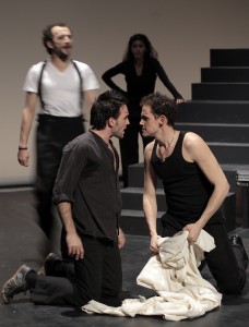 Ils sont beaux, ils sont jeunes, ils sortent du Conservatoire ou quasiment. Ils jouent dans « Les deux nobles cousins, héros maltraités » de William Shakespeare (1564-1616) et John Flechter (1579-1625). Une pièce peu connue, peu montée, une pièce que l’on pourrait croire à première vue de jeunesse, mais c’est tout le contraire. Elle date de la fin de la vie du grand auteur élisabéthain. Comme le dit Sara LLorca, metteur en scène, dans la brochure du théâtre 13 : » Il a fallu élaguer, réduire le texte afin de lui donner la finalité que nous voulions, Denis Llorca et moi-même ».