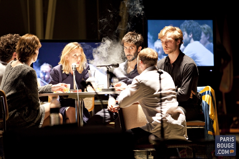 Quatre écrans télé permettent de retransmettre ces témoignages sur scène pendant que les comédiens se déplacent dans un désordre apparent. Fumées de cigarettes recrachées en volutes, ballons de blanc ou autres alcools, une série de micros sur pied, bureau surélevé, mur en bois rappelant l’intérieur d’une bibliothèque et placé en fond de scène, l’espace scénique est exploité à son maximum sans y perdre les comédiens dans un lointain relevant du mirage. A l’avant de la scène, un escalier en arc de demi-cercle accentue le côté kitch de la scénographie et l’on se croirait presque dans une pièce de boulevard ce qui renforce ce côté potache et bon enfant de la proposition durant trois heures. Les hommes sont interprétés par des femmes et les femmes par des hommes, Brigitte Catillon incarne Michel Butor, Annie Mercier, Jérôme Lindon et côté femmes Benjamin Wangermée interprète une Sagan à tomber, drôle et piquante ! L’ensemble des comédiens fait preuve d’un talent remarquable pour embrasser cette œuvre fleuve de Christophe Honoré qui ne cesse de les mettre en difficulté et par le texte et par l’espace scénique qu’ils doivent investir avec intelligence. Pas de failles ou d’hésitations, la mise en scène est réglée au millimètre et l’on quitte la Colline après trois heures passées en compagnie des douze auteurs du Nouveau roman avec le sentiment d’avoir réalisé un voyage riche d’émotions, d’intelligence et de bonheur.