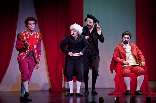 Un décor fonctionnel à la commedia : une rampe de lumières, une estrade, des rideaux, les musiciens à cour, quelques comédiens à jardin, et le tour est joué. Seule, une chaise posée sur un tapis fait office d’accessoire. Mais quelle chaise ! Tour à tour objet de convoitise, cachette, trône ou simple chaise, déplacée, replacée, re-déplacée, elle devient vite un énième personnage du spectacle, pour le plus grand bonheur des petits, comme des grands. Par contre, une attention très particulière a été portée sur les costumes. Inspirés des peintures de Goya, dans sa première période, ils sont éblouissants dans leurs couleurs vives hispanisantes. Delphine Desnus, la costumière, s’est surpassée ! Chaque personnage est caractérisé par une couleur ou un assemblage de couleur et pas un seul personnage n’a été oublié. Même les musiciens, qui, au passage, sont extrêmement bons (un quatuor à vent interprétant seul, la musique de tout un orchestre), ont leur costume. De même, les masques de Stefano Perocco ont ceci de particulier qu’ils ont été étudiés dans le respect d’une certaine sociologie de la fin du XVIIIè siècle, et s’éloignent quelque peu des archétypes de la commedia.