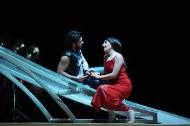 Et la langueur s’installe. Malgré de jolis moments, de subtils jeux d’ombres chinoises ou des transitions délicatement chorégraphiés, l’ensemble se traîne difficilement et sans émotion aucune. Les costumes féminins enserrent les corps rendus disgracieux par l’excessive stylisation des formes. Les choix sont justes mais se résument à des symboles, abstraits. Rouge passion. Blanc pureté. Tout cela ne touche pas au cœur, hélas. Et l’histoire tragique ne nous émeut guère. Pire : on attend le dénouement avec impatience. Que s’achève enfin cette fête de l’Ascension dont on ne perçoit pas la joie !