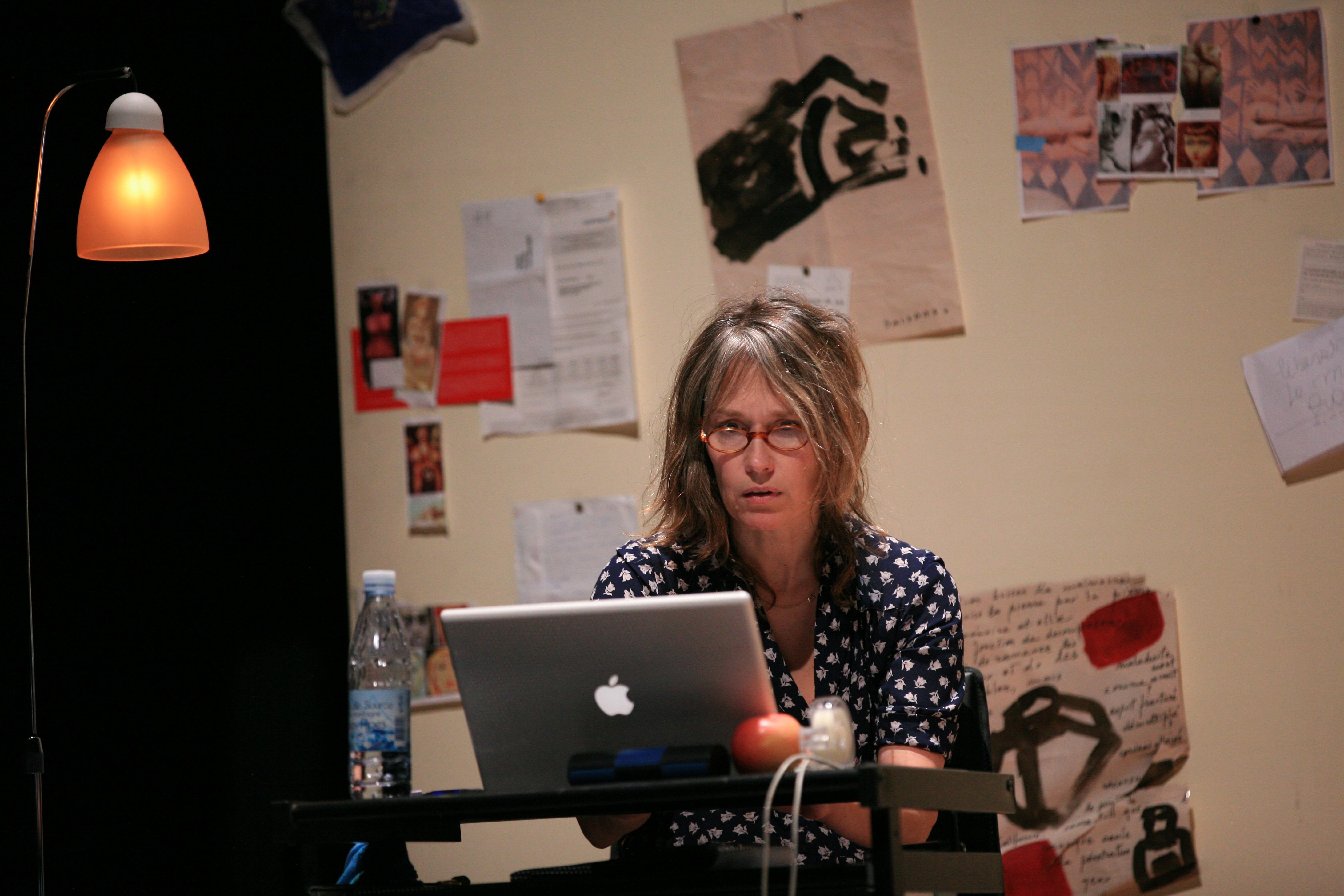 Jean-Claude Berrutti (Théâtre du peuple de Bussang, Comédie de Saint Étienne et, depuis 2011, associé à la scène nationale de Martigues) signe une mise en scène intelligente, aidé en cela par la scénographie efficace de Rudy Sabounghi. Nous sommes dans l’appartement de Madeleine; elle, devant son ordinateur, coincée à jardin, écran de l’ordinateur projeté au centre de la pièce, le mur qui ouvre sur le monde, le mur qui wikipédie à la recherche d’une vérité qui ne peut être la même pour chacun des personnages liés qu’ils sont à leur propre histoire, leur propre drame. Lin l’assaille de questions sur la conjugaison. C’est quoi le futur, le futur antérieur, le conditionnel ? Lin qui ne peut, pour l’instant, que parler et écrire au présent de l’indicatif, et le voisin qui s’incruste, se rend utile et parle de son malheur (le fils malade, la femme qui s’est enfuie), sa façon de lui parler d’amour.