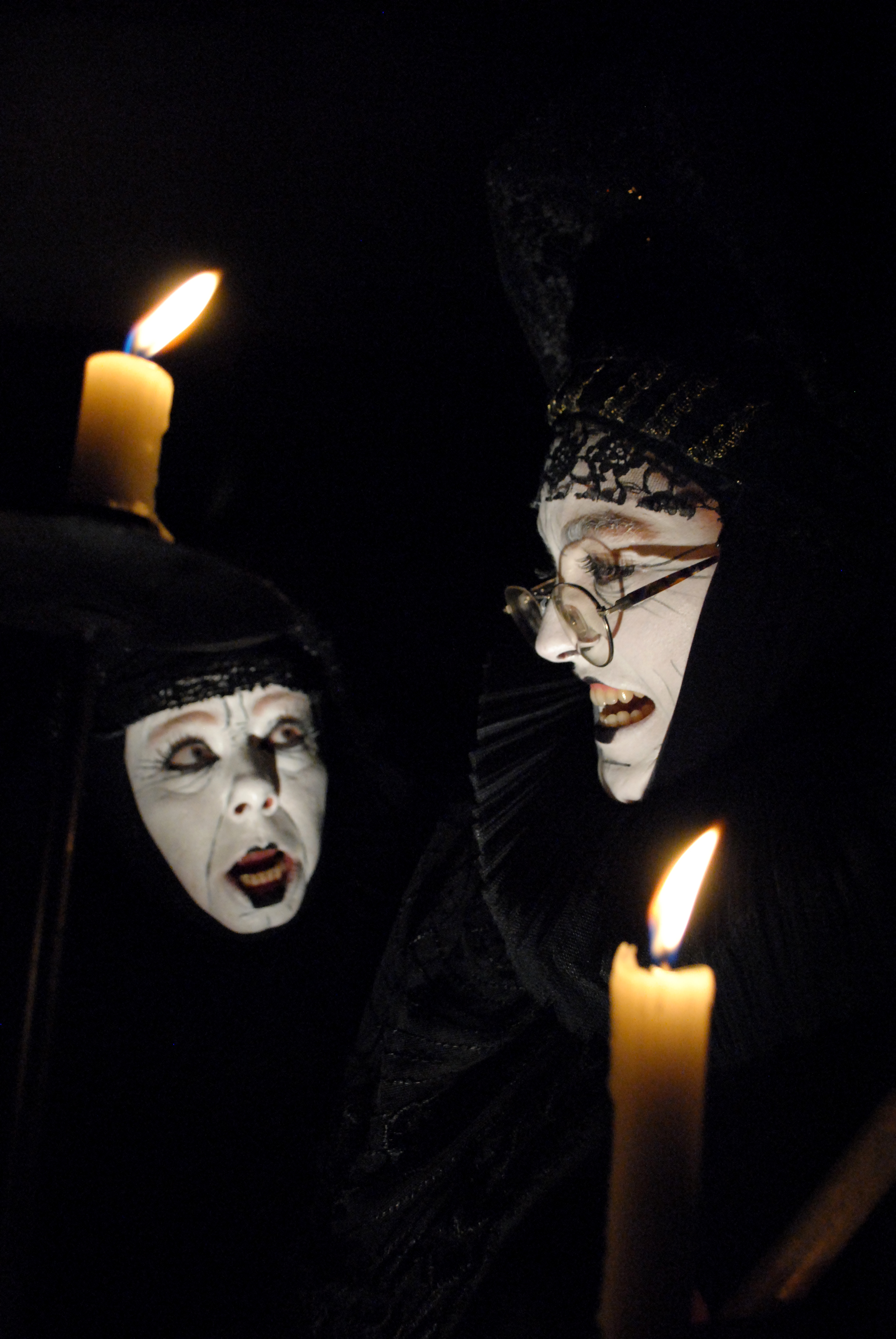 De curieuses figures nous accueillent au milieu des moucharabiehs de la salle boisée : silhouettes endeuillées d’un autre temps, sombres duègnes casquées de hautes mantilles arachnéennes et étranglées dans les rigides godrons de leur fraise. Sourires carnassiers, yeux brillants et faces blêmes, ces monstres-femmes sont les incarnations des cauchemars de Goya : des sorcières échappées d’un sabbat des « peintures noires ». Éclairées en contre-plongée et prolongées par de fantastiques ombres portées, elles dardent sur nous leurs visages grimaçants. Naines ou Ménines, leurs déplacements (les comédiennes se meuvent sur les genoux) s’apparentent aux grotesques déambulations de marionnettes, condamnées à réitérer la vaine répétition de leurs actes : « le fil et l’aiguille pour la femme… »