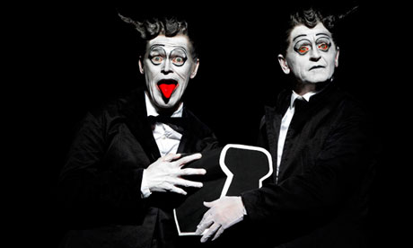 Mikhail Baryshnikov et Willem Dafoe, duo céleste, faces blanchies, cheveux diaboliquement cornés, figurent dans des cris de lumière : des acteurs Nô contemporains, des clowns lunaires, une vieille femme qui tient une pendule sans aiguille, un homme roux qui n’avait rien du tout, de sorte qu’on se demande de qui on parle etc.Baryshnikov et Dafoe jouent un poème rêvé, réunis en un écrivain qui écrit sur un faiseur de miracles, qui n’arrive pas à en faire.