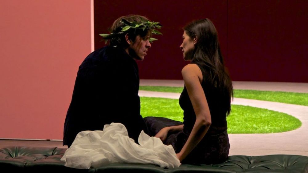 Dans une scénographie accusant toutes les nuances de rose et jouant avec les vives virgules de pelouse verte qui tapissent le sol, les comédiens se déplacent maladroitement, comme engoncés dans un projet qui les dépasse. Faux et le corps emprisonné par un jeu où l’artifice prime, ils tentent de nous faire entendre un texte poétique magnifique, certes, mais complexe. Nous tournant souvent le dos ou se cachant derrière un pan de mur amovible, ils semblent s’excuser eux-mêmes, par de petits sourires gênés, du désagrément qu’ils nous causent.