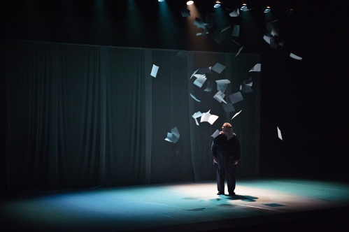 Ce nouveau texte de Mouawad s’inscrit dans une double métaphore : l’envol et l’oubli des lettres de l’alphabet, qui signifie d’abord la rupture avec sa propre écriture, puis le souvenir enfoui d’un acte auquel les personnages doivent être confrontés. Et le vent sonore souffle sur le vaste espace scénique, balayant les pages écrites.