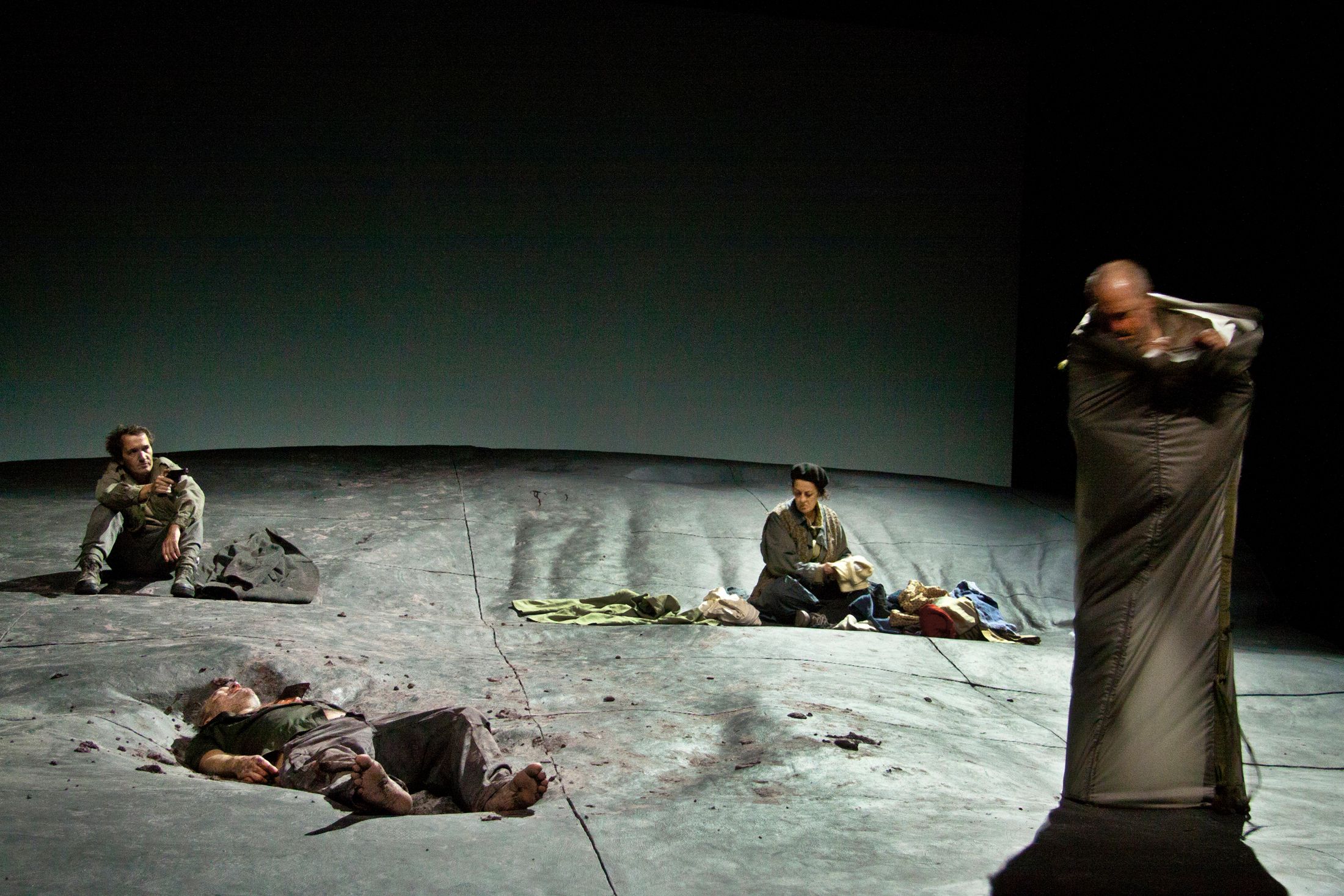 Les Gens semble être comme un point de détail qui jusqu’ici était dans un coin de cette vaste fresque entreprise par Edward Bond depuis la Compagnie des Hommes. À moins qu’inversant la perspective ce ne fût que le point de départ de celle-ci. Et qu’elle révèle à contrario le hors-champs qui précipite nos quatre personnages dans cette tombe à ciel ouvert, cet enfer qu’on ne peut quitter sans y revenir et y pourrir. C’est une vaste méditation en somme puisqu’il ne se passe rien, pas d‘intrigue, pas d‘action, tout semble englué dans l’interaction heurtée entre chacun, la mémoire de ce qui fut peut être. Cette mémoire perdue qui devient un enjeu en ce qu’elle recèle de vérité inavouée. Se souvenir c’est comprendre pourquoi je meurs comme Postern, je vis comme Ken, je survis comme Lambeth, ou je sombre dans la folie -autre mort- comme Margerson. C’est enfin comprendre ce qui me relie aux autres jusque dans l’horreur de la révélation. Car ils sont indissociablement liés par cette horreur qui les traverse d’une façon ou d’une autre. Sans doute le seul lien qu’ils leur restent.