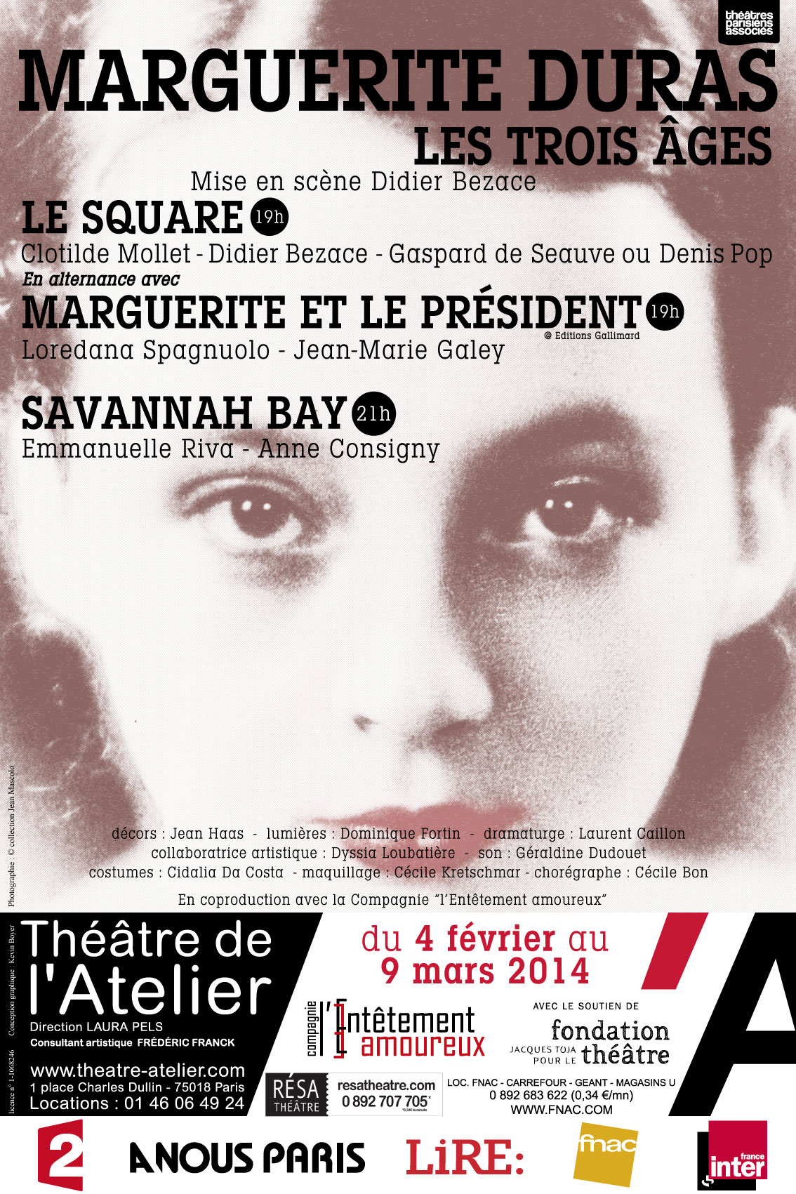 SAVANNAH BAY : Emmanuelle RIVA et Anne CONSIGNYjusqu’au 9 mars – Le Square: mardi, jeudi et samedi à 19 heures, dimanche à 15 heures – Marguerite et le Président : mercredi et vendredi à 19 heures, dimanche à 17 h 30 – Savannah Bay: du mardi au samedi à 21 heures, dimanche à 19 h 30.