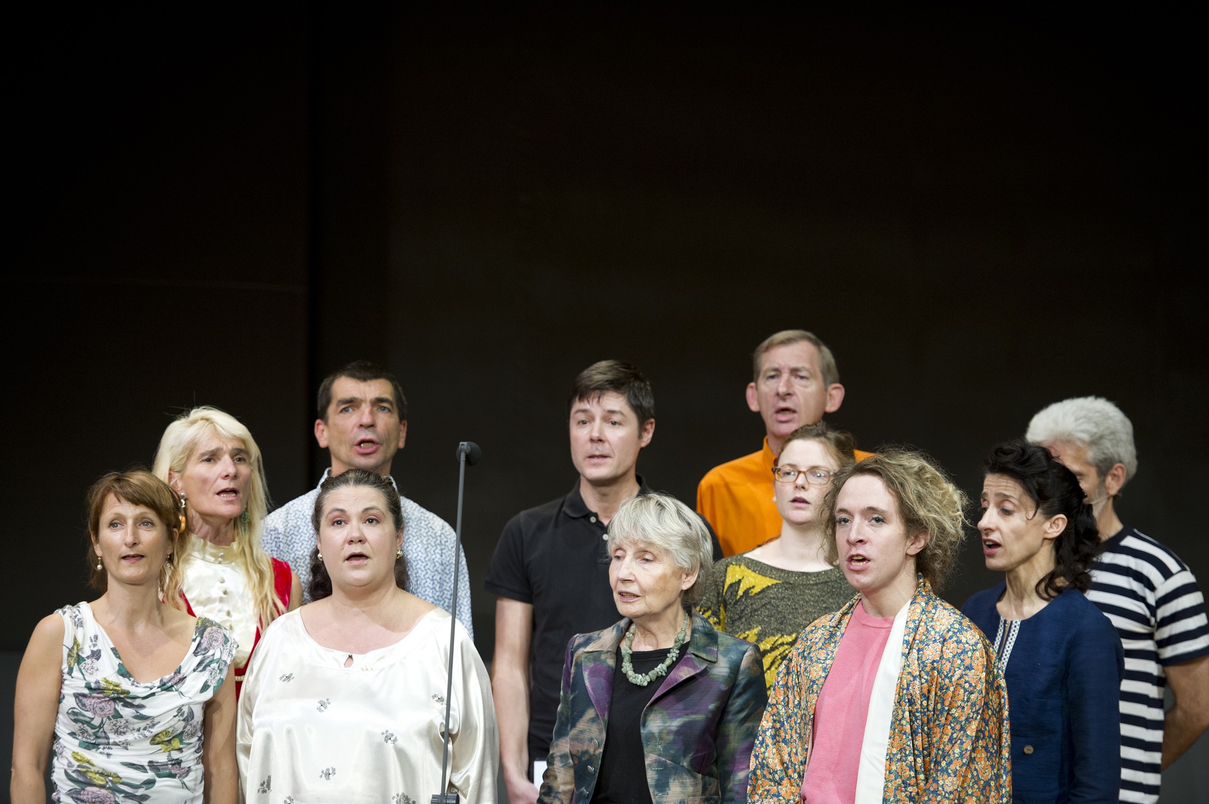 Le « catalogue » de Grand Magasin se poursuit au Théâtre de la Cité internationale. Avec Bilan de compétences, douze personnes font leur bilan de compétences vocales, et nous le restituent en chantant. Pendant une heure, chacun se prête à l’exercice décalé et très drôle de raconter l’histoire de sa voix par le biais d’une chanson autobiographique. C’est donc la voix qui raconte la voix. Mais tout se déroule comme à une réunion : tour de table, écoute bienveillante, accompagnement par les autres s’il le faut, avant de passer au micro. C’est là que le travail déroutant de Grand Magasin opère particulièrement bien : Pascale Murtin et François Hiffler maîtrisent formidablement ce pas de côté que permet le spectacle vivant, et nous placent dans un entre-deux dans lequel on se sent bien. Il y a parmi ces douze chanteurs quelques chanteurs professionnels, quelques chanteurs amateurs, des chanteurs qui dansent mal, des danseurs qui chantent juste, d’autres qui chantent faux… toutes ces personnalités, toutes ces énergies donnent une succession de chansons qui ne se ressemblent pas.