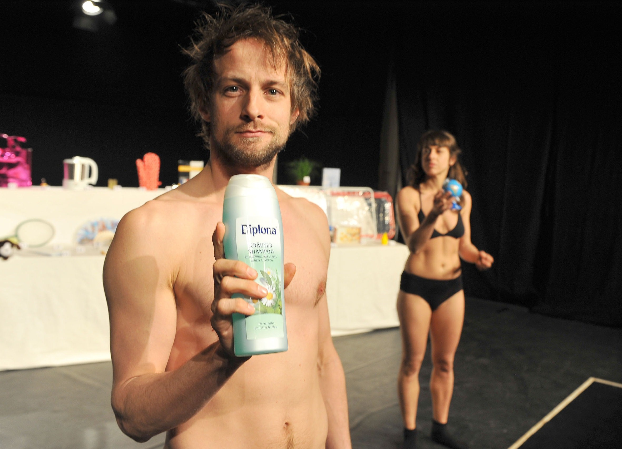 Il est rare que tout nous soit donné d’emblée gratuitement. Ici le spectacle commence par l’expérience du don. Une jeune femme en maillot de bain et un homme en slip proposent à qui veut une foule d’objets insolites tels qu’une boite à bulle de savon, des fleurs en tissu, un pistolet à eau, du papier d’Arménie, une capote, un passeport, un séchoir (et j’en passe), qui étrangement trouvent preneur rapidement. Et si la farce nous amuse à cause de l’impression ‘balayette’, à ce stade nous sommes déjà en train de nous demander si nous ne sommes pas pris pour des imbéciles et si nous ne sommes pas en train de prendre tout ce qu’on nous donne pour argent comptant. Car décidemment on veut vraiment n’importe quoi ! Le couple poursuit sa démonstration et demande en retour au public un tee-shirt, un pantalon, des chaussures. Puisqu’ils ont donné, ils misent sur la générosité de leurs semblables, et ça marche. Quelques uns se déshabillent ou se déchaussent et lorsque certains refusent de donner leurs montres, ils promettent un dédommagement. Mais comme ils n’ont pas d’argent sur eux ils sollicitent à nouveau le public afin qu’il leur prête de l’argent qu’ils jurent de rendre au centuple. C’est l’effet boule de neige. Nous sommes passé du troc au prêt avec intérêts, nous avons glissé dans la logique marchande. Mais la proposition dérape à nouveau. Revêtus par le public, ils s’emploient à nous divertir et nous font deviner quelques grosses machines telles que Godot, Guerre et paix, (j’en passe) pour arriver à Titanic. Chaque fois quelqu’un de pointu reconnaît très vite l’ersatz de scène, et alors qu’ils ne suggèrent que l’écume des choses, nous réalisons peu à peu que nous sommes sensibles aux moindres clins d’œil, réactifs à souhait à toute cette culture que nous avons en commun et en parfaite connivence même avec les produits culturels les plus commerciaux. Avec Titanic nous avons touché le fond en juxtaposant les grands classiques et les films grand public.