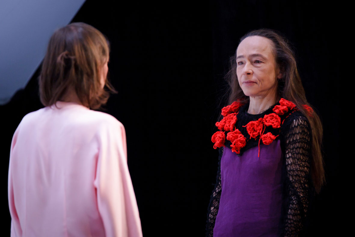 Les comédiens sont raccordés à des micros dont l’objectif est certainement de mettre l’accent sur la dimension intimiste du propos, et pour accentuer une tension trop volontariste. L’ensemble manque de nervosité, de rupture et d’une présence magnétique des acteurs. Peut-on parler de mise en scène ou doit-on évoquer une lecture dirigée ? Le ton monocorde des comédiens plonge le spectateur dans un ennui effroyable, une éprouvante torpeur dont seule, la magistrale interprétation de Dominique Frot la « Demoiselle aux rats », nous extirpe du sommeil d’Endymion, durant un moment extatique. Fragile, sensible, puissante et intrigante à la fois, elle investit le plateau avec une charge émotionnelle balayant tout sur son passage. Toujours sur le fil, son phrasé si particulier fait d’elle une énigme, une exception dans le paysage du spectacle vivant. Elle est le personnage de la « Demoiselle aux rats », celle qui emporte Eyolf jusque dans les fonds marins, là où il se noiera. Pas besoin d’être dirigée, la scène lui appartient, tout comme le texte qu’elle s’approprie avec une aisance toute exceptionnelle.