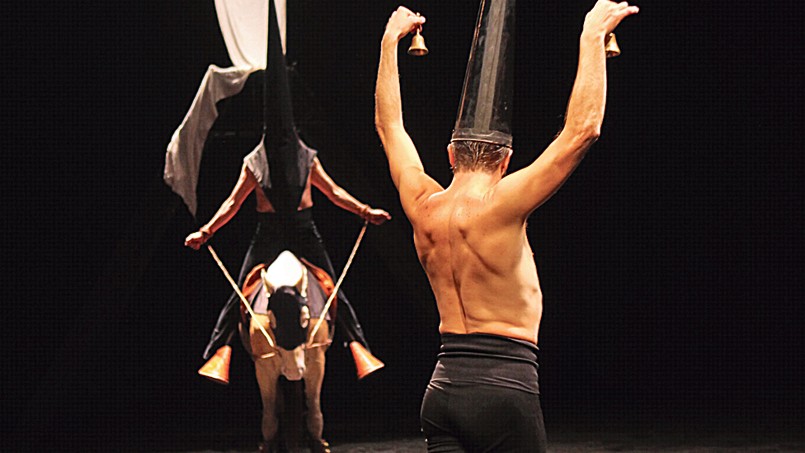 Après Le Centaure et l’animal, rencontre entre l’art équestre et le butô, une confrontation réussie avec Kô Morobushi, c’est au flamenco auquel il se confronte. Andrés Marin est l’invité de cette cérémonie, cette messe poétique et sombre. Ils sont d’étranges pénitents cerclés de fraise qui officient ensemble. Rien ne manque, ni l’encens, ni les cloches, ni la croix. Mais point de Dieu en ce lieu. Juste un bouffon. C’est aussi austère qu’un tableau de Zurbaran, avec la même mélancolie et gravité et pour unique relique un crâne de cheval. C’est aussi sombre qu’un Caravage éclairé de quelques cierges. L’homme et le cheval épousent le même rythme cérémoniel. Le flamenco dégraissé de tout folklore d’Andrés Marin, torse nu, déchire l’air dans le silence. C’est les pieds nus qu’il martèle le sable noir. Gestes amples ou minimalistes, ce que l’on perçoit soudain avec fulgurance dans cette épure extrême, ce silence à peine froissé par le crissement du sable, c’est le rythme qui se déploie, traverse ce corps en tension, fend l’espace. Une énergie contenue qui se joue de la tension et du relâchement qu’elle exerce. Une pulsation interne qui est rythme. Pulsation projetée, éjaculée soudain. Et c’est foudroyant. Cette décomposition attentive du rythme et du mouvement, cette respiration qui fait la danse, c’est exactement ce que Bartabas magnifie avec ses chevaux. En somme ce n’est pas tant le flamenco comme référent culturel qui intéresse Bartabas, même si sa mise en scène est empreinte du mysticisme espagnol réduit à sa plus simple expression et donne à l’ensemble son unité anecdotique, mais comme élément rythmique singulier. Les chevaux qui traversent le plateau ont la même énergie rentrée, ce que déjà dans Le Centaure et l’animal nous percevions étonnés. Ils ne font rien d’extraordinaire, pas plus que Andrés Marin. Rien de spectaculaire non plus, mais un art de la présence brute et butée, amplifié par ce dépouillement volontaire, ce refus de tout folklore. Ce qui est mis en avant c’est le corps et sa capacité à habiter l’espace de sa seule présence. Corps de l’équidé ou de l’homme, il y a peu de différence dans la monstration de ce qui offert de façon abrupte et crûe dans l’écrin de cette cérémonie, cette crucifixion d‘un roi saboté et pénitent. Question de souffle. De vibration. De peau aussi. Cette peau que l’on frappe et qui résonne. Le flagellant est un musicien qui bat tambour et marche au rythme donné de ses mains qui claquent sur son dos et ses cuisses. Comme il répond, chante et marche au rythme de l’animal aux sabots clochetés. Comme résonnent les chaussures ferrées telles des sabots et qui martèlent le sol. Ou la crécelle d’un bouffon au pied de la croix. Comme s’élèvent les motets pour voix seules de Tomas Luis de Victoria, chantés par le contre-ténor Christophe Baska et qui ouvrent et ferment chaque séquence… Cette étrange cérémonie baroque, cette messe des fous, n’est que résonnance et n’appelle que le silence pour mieux révéler, comme un mystère, la danse, soit une question de corps, de rythme, de souffle et d’espace.