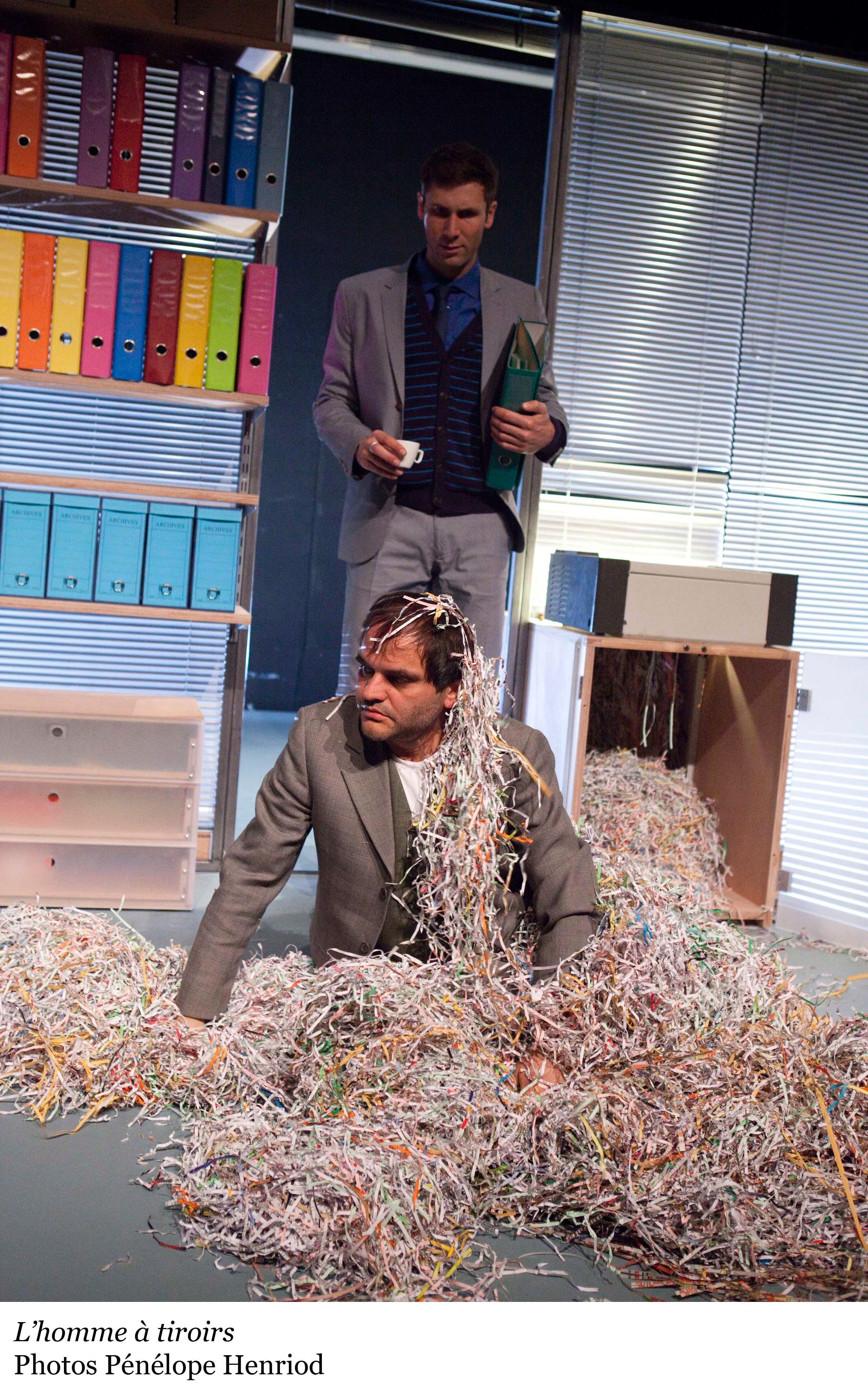 “L’Homme à tiroirs” de Jean-Yves Ruf est une œuvre théâtrale originale, destinée au jeunes public, qui prend ce conte social et métaphysique d’Herman Melville comme matière première de sa créativité. Fort de l’imaginaire que leur a inspiré la lecture de ce texte, metteur en scène et comédiens se sont laissés porter par les improvisations d’une démarche créatrice, dont ils revendiquent la sérendipité. Guidant le travail d’expression, Jean-Yves Ruf a favorisé l’émergence d’un spectacle fait de rythme, d’image et de musicalité. Il a facilité l’apparition de cette branche de création dérivée. Bouture au fruit original dont le noyau reste la figure essentielle de “Bartleby”, le contrevenant intemporel de la société industrielle et bureaucratisée, mais dont la chair s’est adaptée à la forme contemporaine de nos aliénations sociales.
