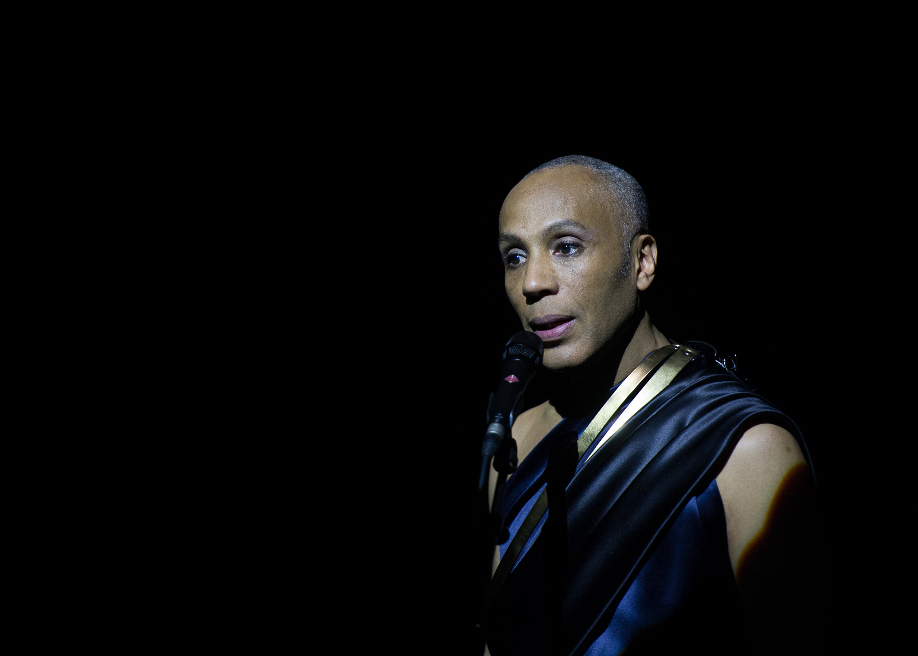 Jean-René Lemoine est Médée. Plateau nu, parole nue et crue. Mise en scène dépouillée à l’extrême qui laisse au chant de Médée, la plainte froide de Médée, occuper tout l’espace. Seul devant son micro, le corps hiératique, à peine quelques mouvements de bras retenus, c’est un corps qui se contient, qui se tient, fiché comme une lance. Plus tard viendra l’esquisse d’une danse, seul et unique mouvement d’ampleur. La parole est tranchante, incisive, vibrante. Rien de craché, rien d’hurlé. Nul éclat de voix, d’imprécations jetées. C’est un orage blanc, une mer étale. Une fois, une seule fois, un bref instant, la tension se libère, comme un abcès qui crève.