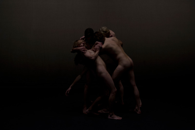 Ténèbres. Une plongée abrupte dans le néant. On ne voit rien. Nous sommes aveugles. Nous sommes en apnée. Un souffle continu gronde et monte du plateau invisible. Nous sommes suspendus à quelque chose qui doit advenir et dont nous ignorons tout. L’œil s’affole. L’obscurité respire. Étrange sensation que celle là, d’une obscurité qui respire. D’une obscurité devenue organique, vivante, un muscle battant, préhensible. Et de ce néant lentement surgit la vie. Des silhouettes esquissées qui se matérialisent, fantomatiques, pour s’estomper aussitôt. À peine si l’on perçoit ces corps immatériels qui semblent flotter, fragiles, éphémères, dans cette nuit compacte. À peine a-t-on le temps de les apercevoir. Les corps semblent sourdre de ce néant, de ce vide, avant que de s’atomiser, se désagréger. Quelques gestes, quelques traces de mouvements étranges s’évaporent ou semblent absorbés par l‘obscurité. Des formes tremblent et se défont. L’œil scrute. Et lentement, doucement, la lumière va se révéler, sculpter d’ombre ces corps qui s’étreindront bientôt avec gravité, fouleront le raisin et la tomate dans une orgie paisible et sensuelle. Bruits de mastication, de chair foulant la pulpe, de chairs frottées à d’autres chairs, de respirations, de souffles, il y a quelque chose de terriblement, de magnifiquement organique. Les corps enchevêtrés, porteurs d’inconnus, se dénouent pour apparaître dans toute leur nudité, toute leur humanité, dans un abandon d’une beauté bouleversante, à couper le souffle.