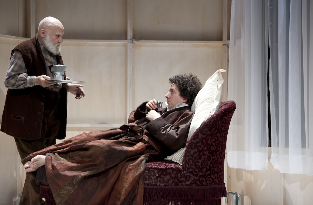 Dans sa subjectivité sur la velléité d’un Oblomov vraisemblable (parmi tant d’autres), Volodia Serre met en scène une adaptation convaincante et très proche du récit. On peut interpréter cette variante comme le chant du cygne d’une Russie vieillissante, en attente d’une vie nouvelle. La scénographie de Marc Lainé, sur l’axe d’une méridienne, nous fait voyager astucieusement d’un lieu à l’autre, bien aidés en cela par les lumières de Kévin Briard. Pour ce qui est de la distribution, nous avons apprécié le « couple » Guillaume Gallienne, Yves Gasc. Le premier corps et âme à son rôle. Mais, peut-être gagné par l’oblomovstchina, sa voix se perdait pour nos oreilles fragiles. Quant au second, il nous a ravi de sa mauvaise foi talentueuse. Il faudra tout de même que cette mise en scène ne tombe pas dans l’oblomovisme, et trouve un rythme moins paresseux, nonobstant la bonne soirée que nous avons passée.