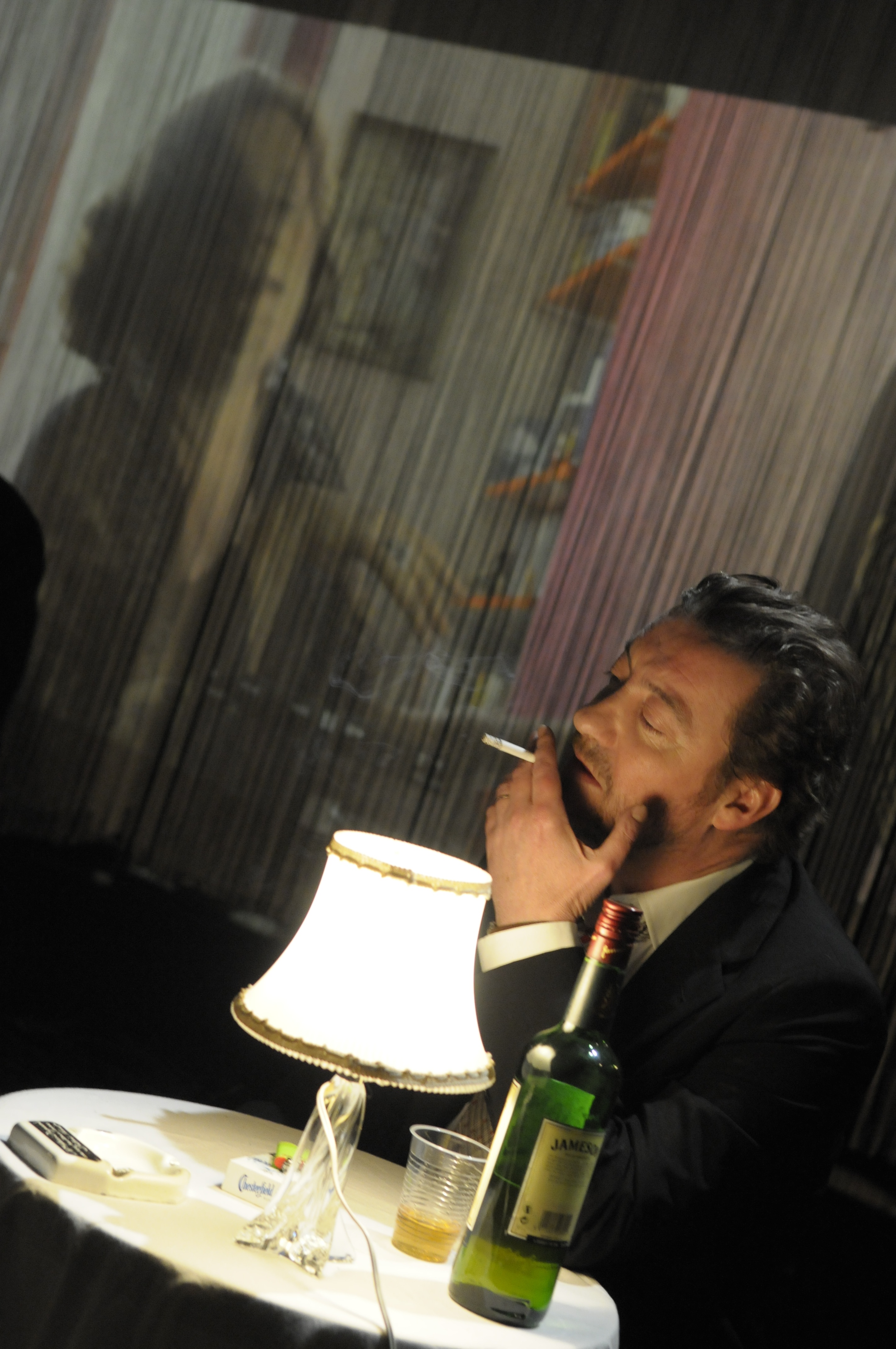 Disparu en 1991, à l’âge de 62 ans, Serge Gainsbourg était venu au monde en 1928, un an avant Jacques Brel ou Claude Nougaro. Sa carrière artistique, exercée principalement dans le domaine de la chanson, fut particulièrement intense en créativité et en productivité. Bien que vingt années se soient déroulées depuis sa disparition, bon nombre d’artistes du music-hall francophone actuel moirent encore leurs textes et leurs dictions de la gravité lapidaire, sombre et brillante, dont il para ses vinyles. En plaçant leur spectacle-concert “Par hasard et pas rasé”, dans une disposition de cabaret, Camille Grandville et Philippe Duquesne reviennent aux origines de la démarche artistique de Gainsbourg qui débuta dans la foulée de Boris Vian au “Milord L’Arsouille”, lieu fameux des années 50 dont le nom révèle étrangement le fond du dandysme de l’artiste. “Par hasard et pas rasé” se déroule de nos jours et raconte la soirée d’un groupe de musiciens itinérants, professionnels jouant de gala en gala, représentant un ensemble modeste, consciencieux et fort sympathique. Le groupe, qui est composé d’un chanteur-leader, de deux choristes féminins et d’un trio piano, contrebasse, batterie, a été, ce soir là, engagé pour rendre hommage au répertoire de Gainsbourg. Déployant avec beaucoup de subtilité mille détails qui réorientent le cadrage, la mise en scène enchevêtre les différents niveaux de narration et développe son propos, sans couture apparente, à travers les digressions entre musiciens, les réflexions et les souvenirs personnels du chanteur incarné par Philippe Duquesne, les évocations scopitone de la vie de Serge Gainsbourg et, bien entendu, l’interprétation live des chansons de l’artiste.