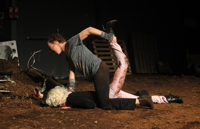 Les spectateurs n’entrent pas tant dans un théâtre que dans une véritable arène à la musique tonitruante et au milieu de laquelle un groupe de comédiens monstrueux et sanguinolents jouent à la pétanque. Cela dure le temps que tout le monde s’installe. Très longtemps. Immédiatement, on se dit que ces gens peuvent tout oser, et les spectateurs semblent en avoir envie. Et effectivement, ils vont tout oser.