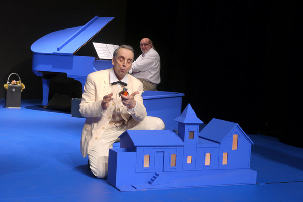 C’est dans un décor couleur paquet de Gauloise que va se raconter les dix dernières années de Ravel. Quelques objets représentent le monde qu’il traverse. Un piano à queue, un fauteuil, une table, un petit train électrique, une énorme valise, la maquette d’un paquebot, la représentation de la statue de liberté, une baignoire, une maison de poupée. Une étrange atmosphère blues plane. Son monde ressemble à une fiction, les personnages à Gulliver, les lieux en modèle réduit prennent corps au fil du récit, s’animent d’un rien, d’un geste, d’une phrase se remplissent de vie. Trois acteurs et un musicien orchestrent ce voyage dans le temps, façonnent un quai de gare, sculptent une foule, fabriquent de la solitude. Car Ravel est avant tout un solitaire, difficile à cerner, il s’habille de mystère que nul n’ose démystifier. Et c’est sous l’œil attentif d’Echenoz qu’il va, un peu, peu à peu, se révéler. C’est à force de gros plans, qu’entre les lignes on commence à l’approcher. Un dandy se profile. On le prend au vol, on le découvre par petites touches, d’abord méticuleux, presque maniaque, on l’attrape dans sa salle de bain qui se prépare mollement à sortir, tandis que dehors on l’attend, on le saisit parfois, on le presse doucement, à peine, on patiente avec lui énormément.