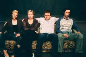 Tout tend à brouiller les pistes entre réel et fiction, dans S Druge Strane (de l’autre côté). Ces quatre personnages, assis sur leur canapé avant l’entrée du public, nous regardent pendant de longues minutes. Le temps s’étire avant que le spectacle ne commence. Puis ça y est, on le sent, l’un des comédiens va parler. Mais un message en voix off interrompt sa tentative. Le spectacle n’est pas tout à fait commencé. Bien sûr qu’il l’est, depuis le début, mais tout tend à nous faire croire que pas encore. Le jeune homme essaie de nouveau. Il parle d’une femme. Petit à petit, une histoire se raconte. Les quatre personnages veulent parler de cette femme. Cette absente, la même : une voisine, une mère, une amie. Chacun veut raconter son rapport à cette femme, et chacun se raconte à travers cette histoire, finalement. La lumière reste allumée dans la salle, côté public, pendant toute la durée de la représentation. Le frottement entre réel et fiction va jusqu’à contaminer le dispositif technique de la représentation. Des accidents arrivent sur le plateau. Quelque chose déraille, tout à coup. Si le spectateur devine que tout est prévu pour faire théâtre, il est tout de même surpris. Le doute s’installe.