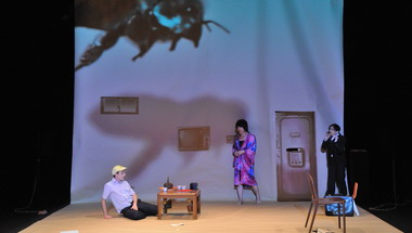 Hikedi Noda excelle dans cette transformation. Le petit bonhomme sautillant, affable et souriant, respectueux de la famille, devient un homme incontrôlable et manipulateur, rageur, d’une violence sans borne apparente. Etonnant et formidable comédien qui virevolte sur le plateau, léger, léger et drôle mais d’une présence bientôt inquiétante. Et metteur en scène malicieux et intelligent. Car la mise en scène et la scénographie sauvent l’ensemble de l’enfermement, de cette spirale dans l’enfer qui très vite pourrait s’avérer anxiogène, étouffante. Traité sur le mode de la farce, il y a de l’exagération volontaire et bienvenue, un grossissement subtil des effets, qui désamorce, sans lui retirer, la violence du propos. Elle n’en apparaît que plus terrifiante. Le rire s’étrangle. C’est certes grotesque mais toujours juste, sans jamais rien de trop, ni d’effet gratuit. Tout converge vers le basculement final, tout mène à ce débordement, ce déchaînement de violence sans jamais verser dans le gore. Le grand guignol est évité de façon judicieuse. Cela aurait été un contresens absolu de surenchérir. Non, c’est plutôt Chaplin au pays du manga ! La scénographie relaie l’ensemble de façon originale. Dépouillée et se métamorphosant au besoin. Soit une vaste feuille de papier qui recouvre l’intégralité du plateau sur laquelle sont projetés, effets visuels, quelques éléments de décors, où se découpe en ombre chinoise, le monde extérieur et que l’on découpe ou rafistole de scotch en fonction des besoins. Un théâtre de carton et d’objets qui, manipulés se transforment à vue. Une maison de papier qui finira par engloutir ses occupants. Mais alors cette histoire d’abeille me direz vous ? Il fallait bien qu’un homme comme Ido sache que l’on rencontre plus fort que soi…
