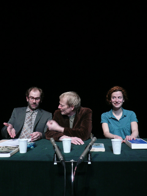 Ils sont tout d’abord deux, Janine Jacquard (remarquable Camille Trophème) et Jean-Pierre Von…… quelque chose (pour les noms danois il faut un peu d’expérience !). Leur entrée puis leur installation en vérifiant les micros et leur présentation est magnifique de justesse et de vérité. L’une présente l’autre et l’on se perd dans les titres, la liste des universités et des chaires où ils officient, si longs, si bavards. Nous sommes dans le monde merveilleux de l’intellectualisme et des savants.