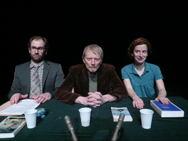 Ils sont tout d’abord deux, Janine Jacquard (remarquable Camille Trophème) et Jean-Pierre Von…… quelque chose (pour les noms danois il faut un peu d’expérience !). Leur entrée puis leur installation en vérifiant les micros et leur présentation est magnifique de justesse et de vérité. L’une présente l’autre et l’on se perd dans les titres, la liste des universités et des chaires où ils officient, si longs, si bavards. Nous sommes dans le monde merveilleux de l’intellectualisme et des savants.