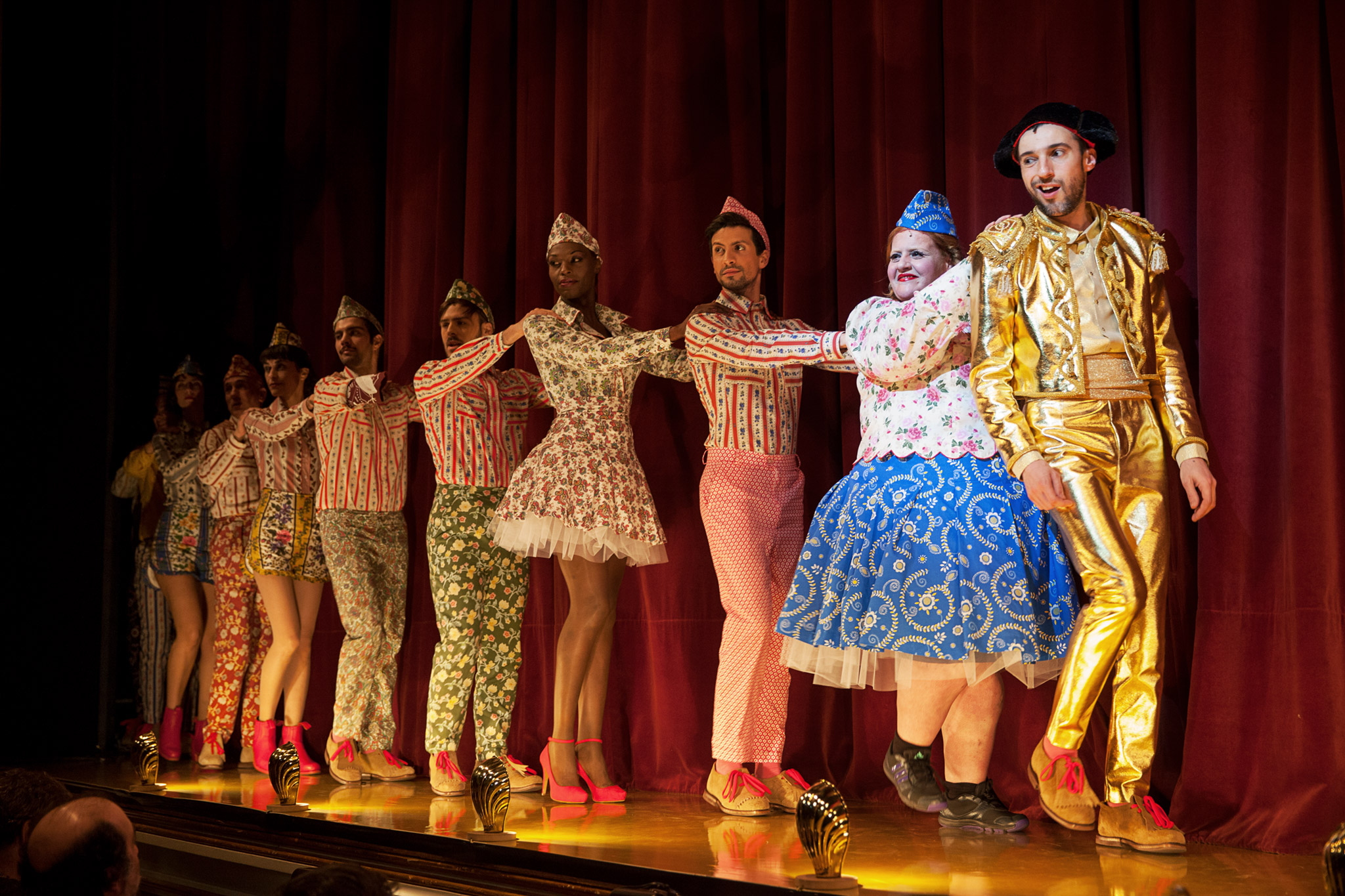 Le Teatro Praga s’empare de tout ça et opte pour un thème bien particulier. Tropa-Fandanga célèbre le centenaire de la guerre de 14, la quarantième anniversaire de la guerre de la révolution des Œillets et la fin des guerres coloniales de 1974 (Angola et Mozambique). En somme un siècle d’histoire pour brosser un tableau décapant et chaotique du Portugal. Car tous les clichés portugais ou presque sont déclinés et promptement dézingués. Un superbe jeu de massacre qui passe à la moulinette les images traditionnelles de ce petit pays. Une façon de dire que le Portugal est quand même ancré dans la modernité et l’Europe, même frappé de plein fouet par la crise. Parce qu’il y a une nouvelle guerre aujourd’hui, qui ici est épinglée, la guerre économique, on se demande comment y faire face quand on est Portugais et qu’on fait office de parents pauvres. La réponse est ici très simple: le Fado ! Le Fado rendu obligatoire dans le monde entier. La seule arme, avec la Vierge de Fatima, qui peut imposer le Portugal… La Vierge de Fatima qui ici est n’est guère épargnée en fadista va-t-en-guerre… Le propre de la revue étant de n’épargner personne, même Linda de Suza (se souvient-on encore d’elle ?) reçoit un hommage inattendu, aussi drôle que cruel. Car l’irrévérence et l’absurde sont bien la signature de cette revue militaire endiablée et colorée. Mais la réalité sous ce vernis acide et burlesque pointe aussi son vilain nez. Il y a toujours un tableau sérieux dans toute revue. L’intervention de l’actrice Joana Manuel lors d’une audition à Lisbonne en Avril 2013, présente sur le plateau et de nouveau donnée ici est un formidable résumé du Portugal contemporain mais également des espoirs portés de la révolution de 1974 mise à mal aujourd’hui. Surgit brusquement la réalité sans fard.